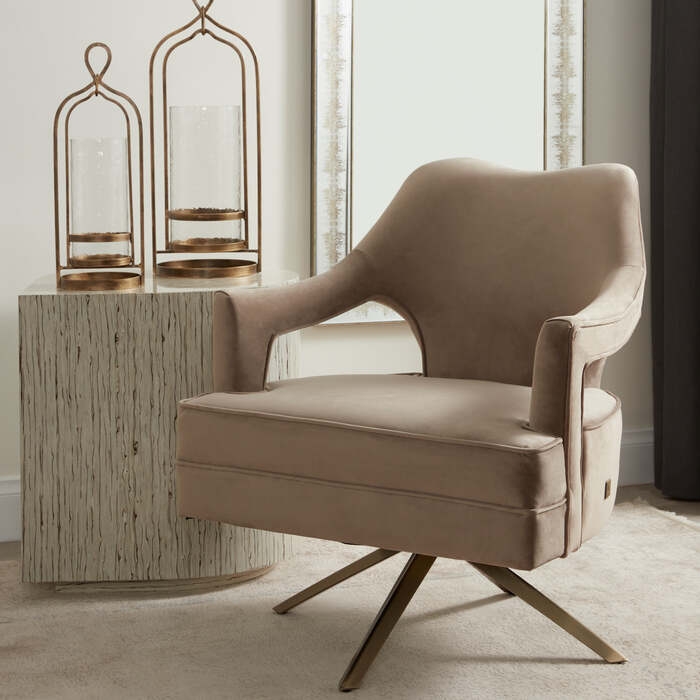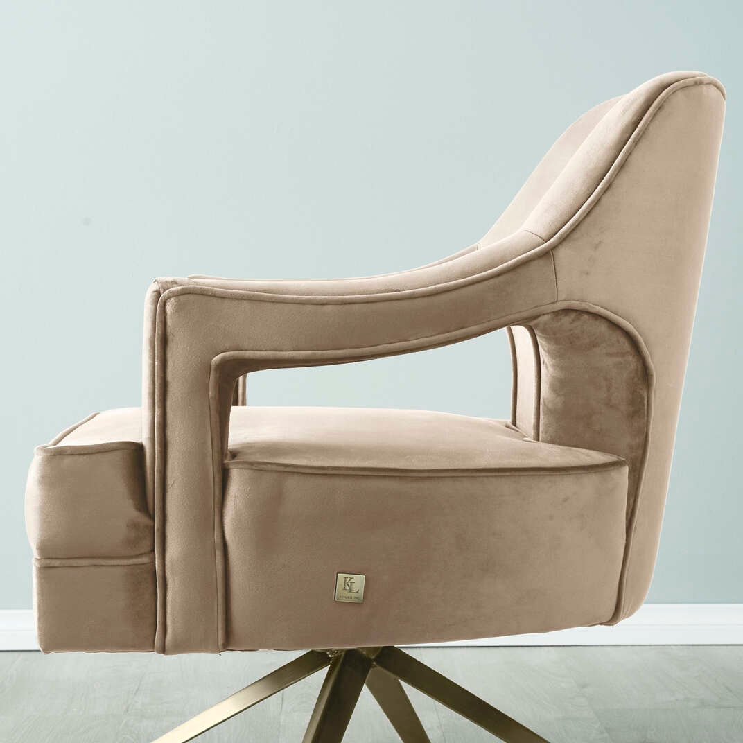 The Burton Occasional Chair combines modern design with timeless elegance. Its beige coloured velvet upholstery adds luxurious softness, while the sleek, curved frame complements any interior style.