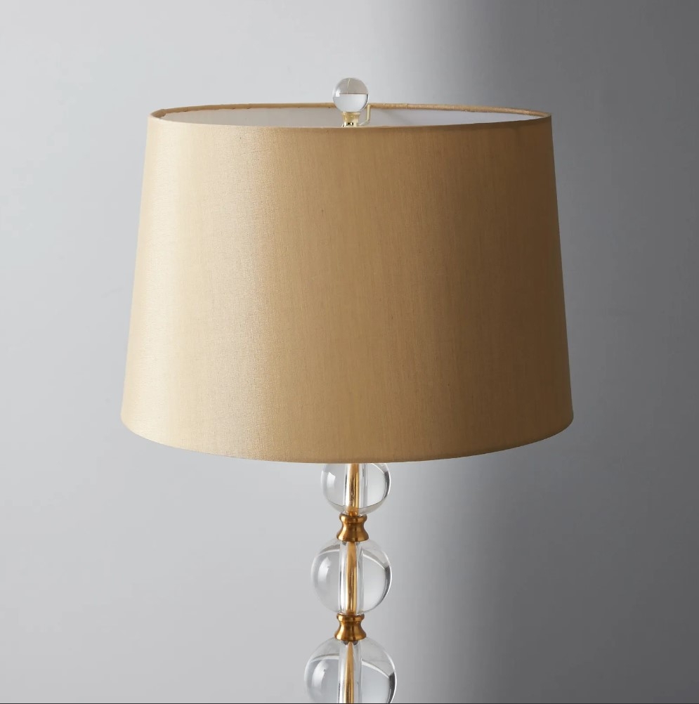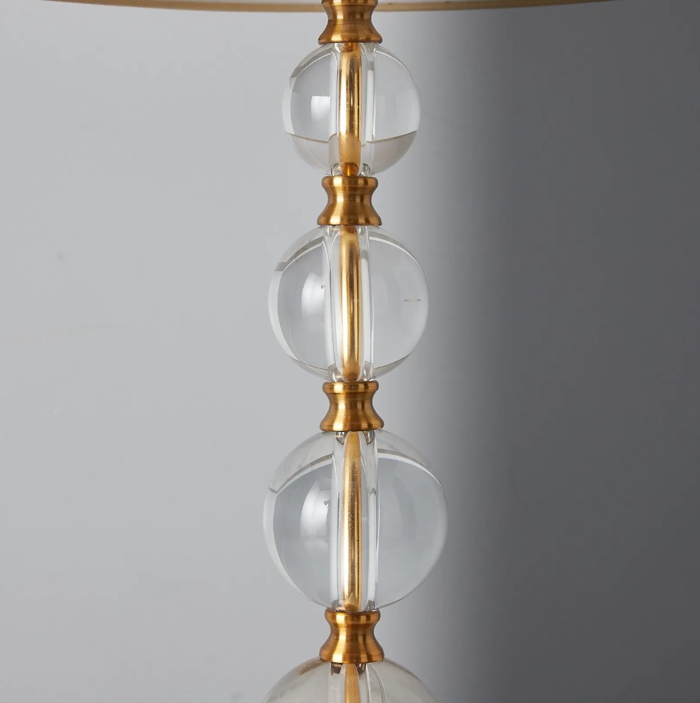 The true masterpiece of this piece lies in its captivating body. Embellished with a succession of clear glass spheres, each one meticulously positioned, the lamp's stem is a testament to the allure of refined detail. These spheres, ascending in rhythm, capture and reflect light in a dance that is both subtle and mesmerizing.