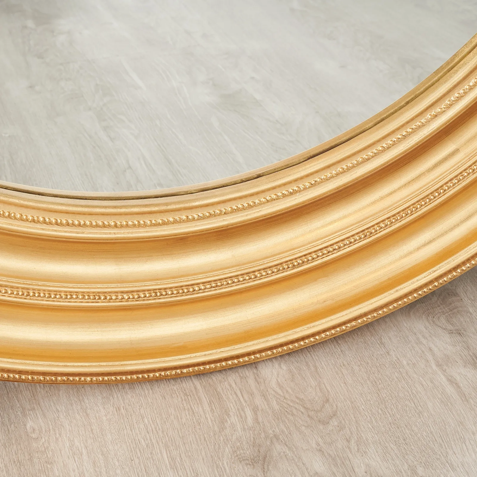 Its frame is crafted from wood and features detailed moldings with a deep antique gold finish that adds a touch of classic elegance.