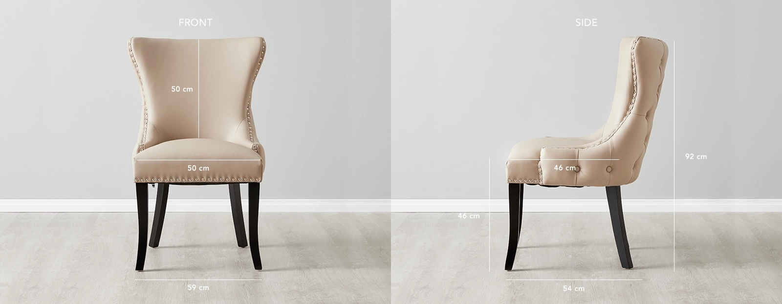 Elevate your dining experience with the exquisite Camille II Beige Vegan Leather Dining Chair. This remarkable chair seamlessly blends classical design with luxurious detailing, creating a seat that is both stylish and comfortable. The Camille Dining Chair features a beautifully crafted wooden frame, enveloped in premium quality Beige Vegan Leather. The soft and supple texture of the leather upholstery adds a touch of opulence to your dining space, inviting you and your guests to indulge in luxurious comfort.