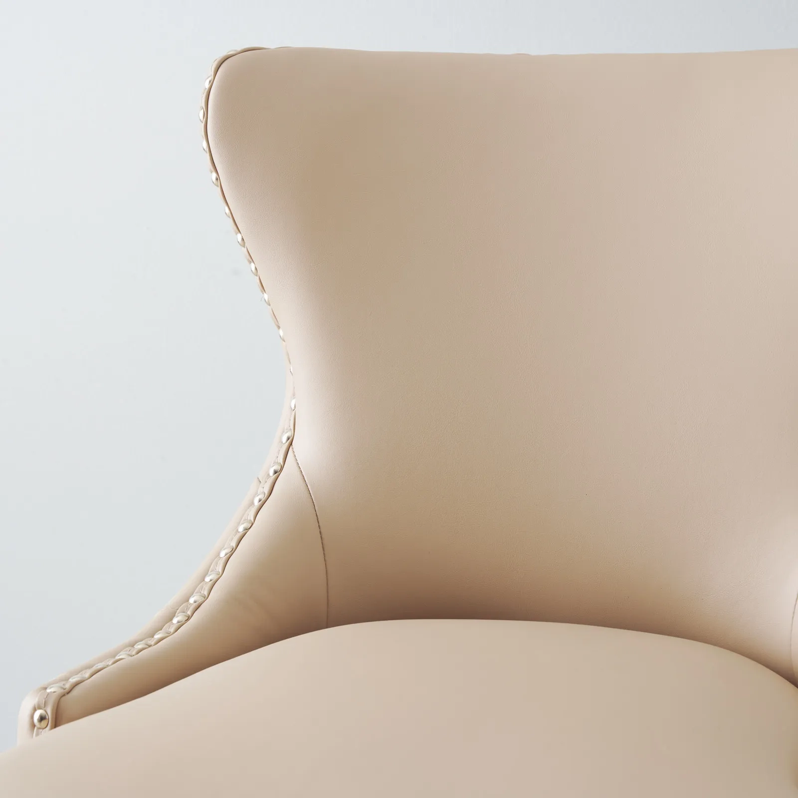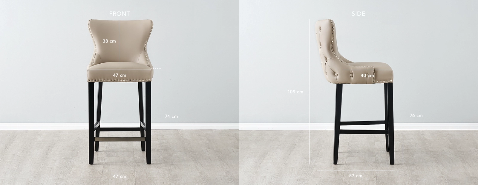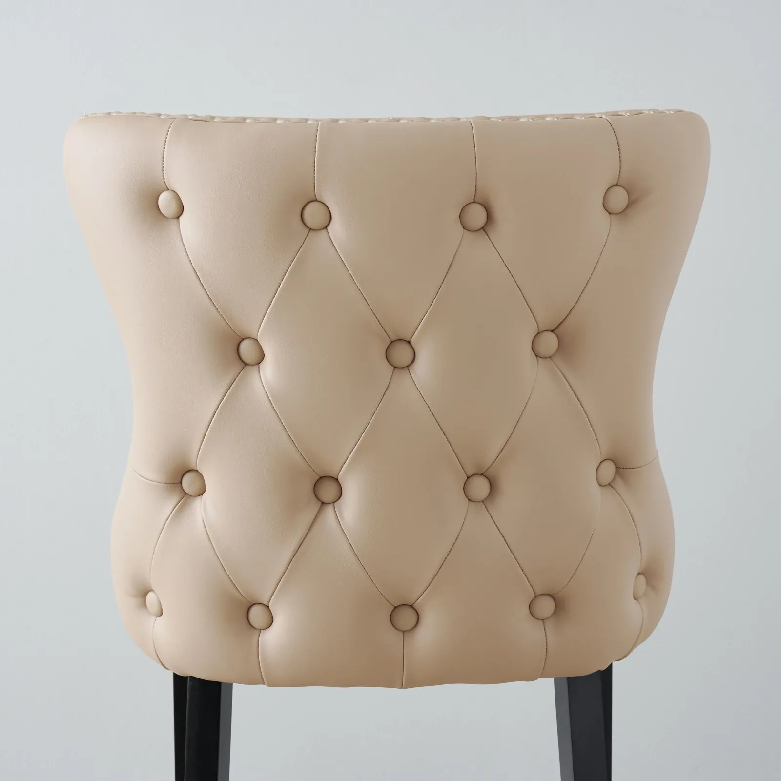 Transform your home bar into a realm of refined luxury with the Camille II Sand Beige Vegan Leather Bar Stool. Immerse yourself in the sheer opulence of its exquisite features, meticulously designed to provide both visual allure and supreme comfort. Its stunning seat is upholstered in luxurious Sand Beige Vegan Leather. Fashionable button studding gracefully lines the borders around the seat, adding a touch of refinement and visual interest. The whole backside is adorned with sensational button tufting, creating a mesmerizing pattern that demands attention and elevates the overall aesthetic to new heights.