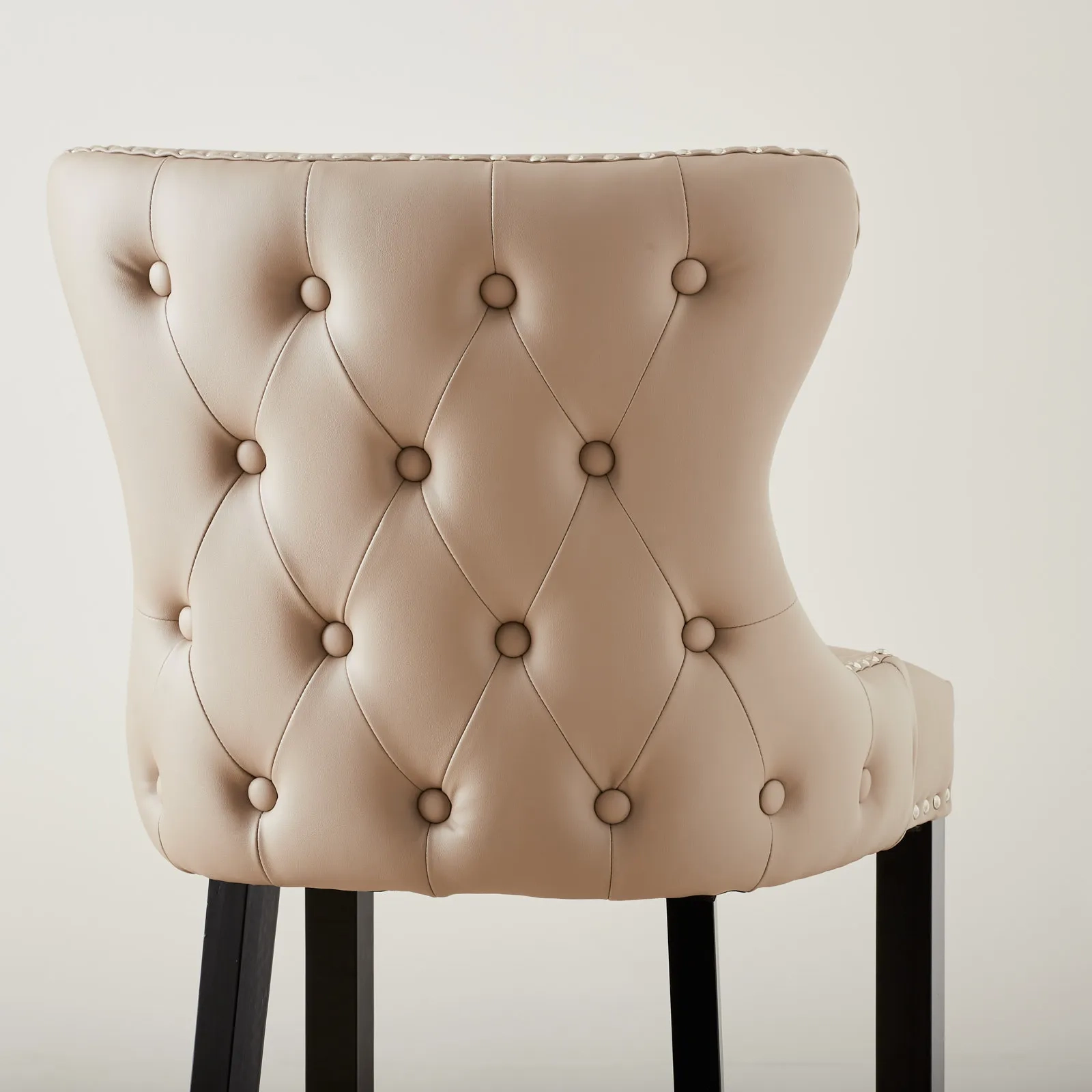 Turn your home bar into a haven of sophistication with the Camille III Bar Stool. Its Beige Vegan Leather seat, accented with refined button studding and intricate tufting, enhances both comfort and visual appeal.
