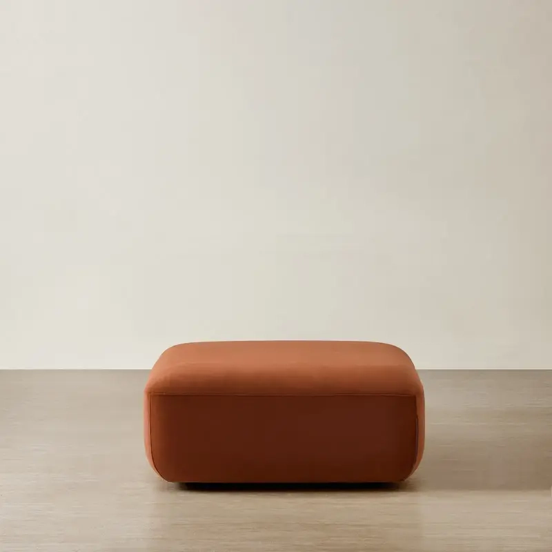 The Capri Ottoman is wrapped in velveteen fabric that carries a quiet glow, giving the piece a calm richness. Its rounded, sculptural form keeps a smooth profile that pairs seamlessly with any configuration in the Capri collection.