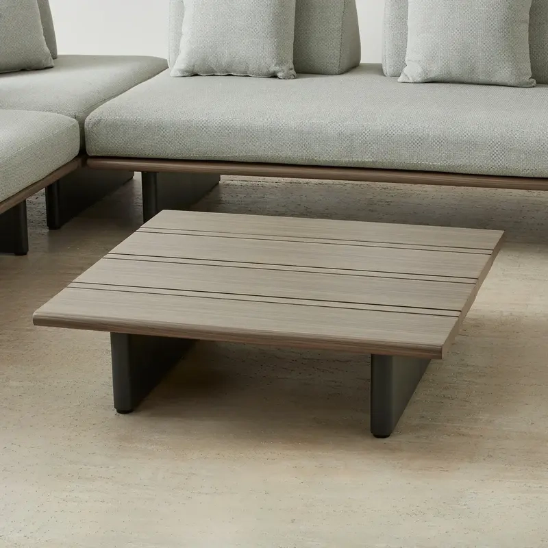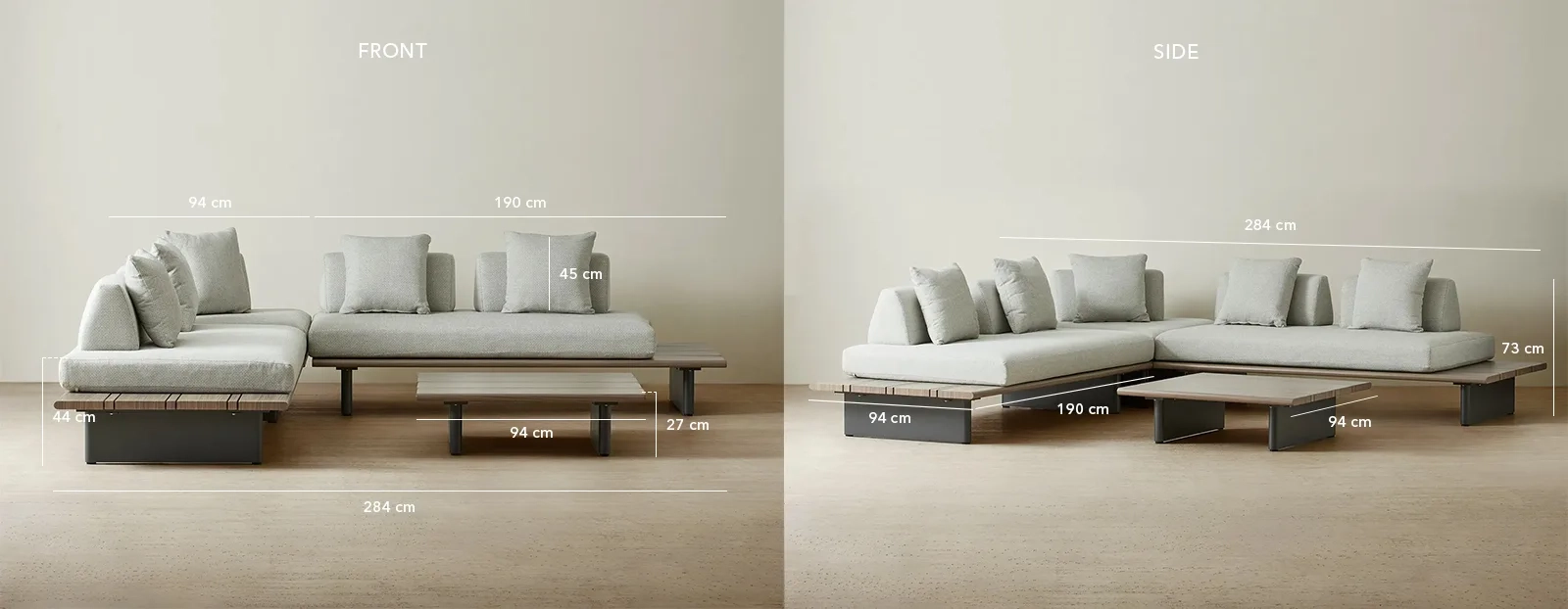 Integrated timber side platforms provide convenient space for drinks, books, or décor, while the included matching coffee table offers a central surface for serving and entertaining.