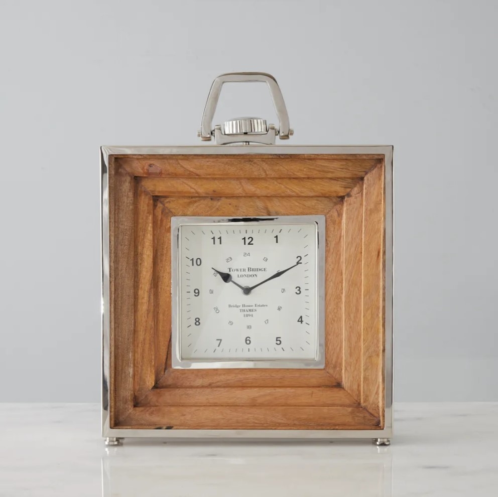 Discover the Cartier Wooden Table Clock, a harmonious blend of modern design and timeless elegance. With a striking interplay of silver and natural wooden hues, this clock becomes more than a timekeeping device—it's a statement piece. Its face, a pristine expanse framed by clean white borders and numbers, offers a contemporary touch.