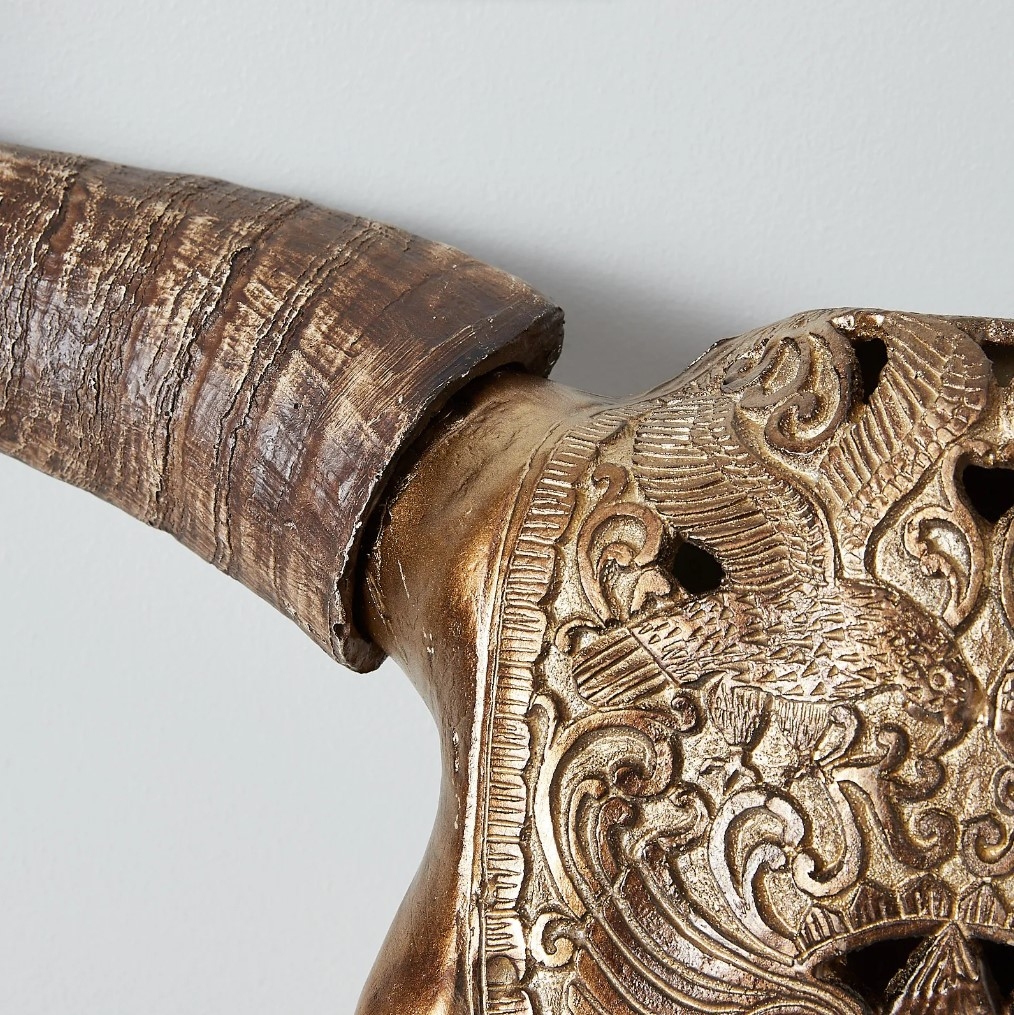 The bull skull's form is transformed into a canvas of intricate details, where every etch and curve tells a story of skill and creativity. From the ornate patterns on its forehead to the mesmerizing sweep of its horns, each element is masterfully brought to life.