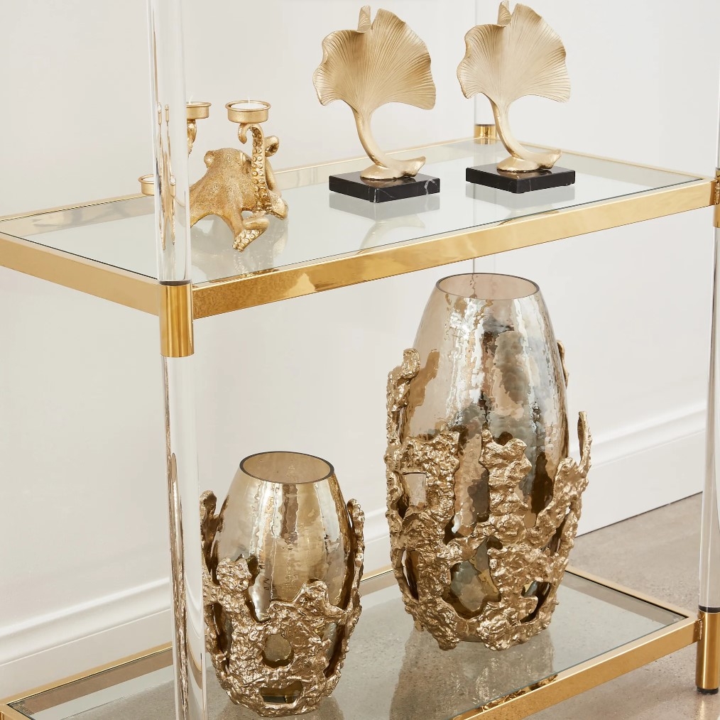 Imagine a vase that goes beyond the ordinary, a vessel that not only holds your floral arrangements but becomes an integral part of the composition itself. The Catalan Vase achieves just that. Its semi-transparent glass allows the beauty of your flowers to shine through, while the encircling golden moss of aluminum adds a touch of opulence and drama.