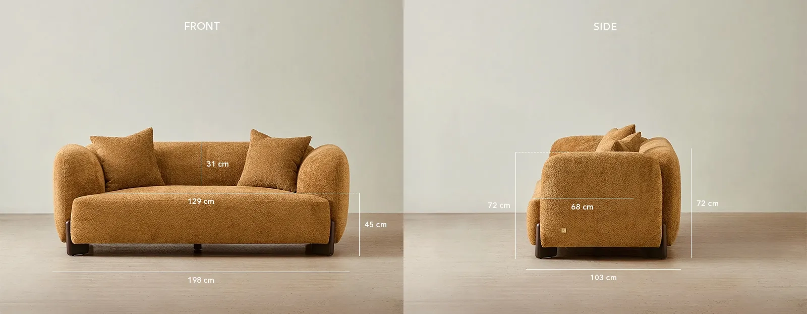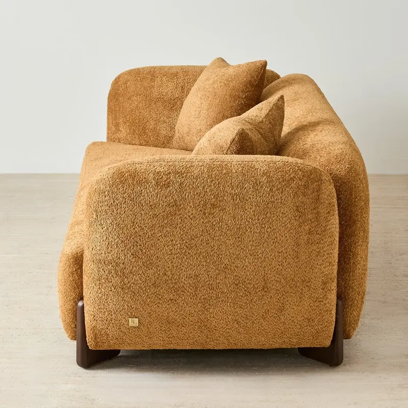 The Celia 2-Seater Sofa boasts a plush, textured woven fabric that’s both cozy and resilient. Its warm mustard hue injects life into any room, while the smooth, curved shape creates an inviting vibe.
