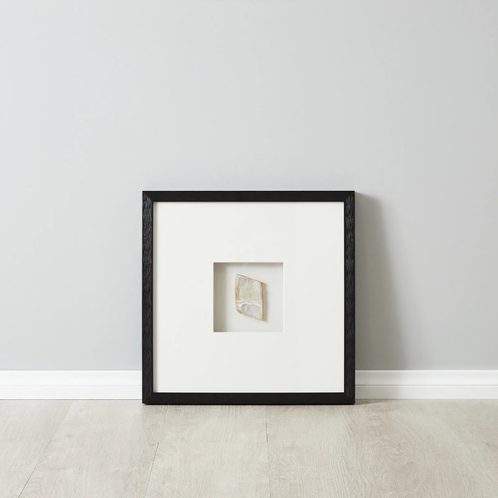 The Clear Agate Shadow Box with Black Frame is a delicate balance of modern design and the imperfect beauty of nature. Enclosed within a sleek black frame is a single agate that comes in clear colors, almost mimicking the perfect transparency of glass, yet still bearing natural imperfections.