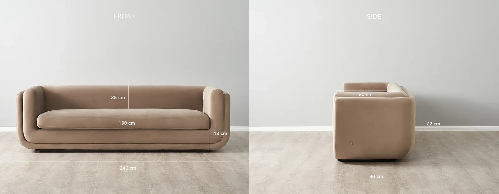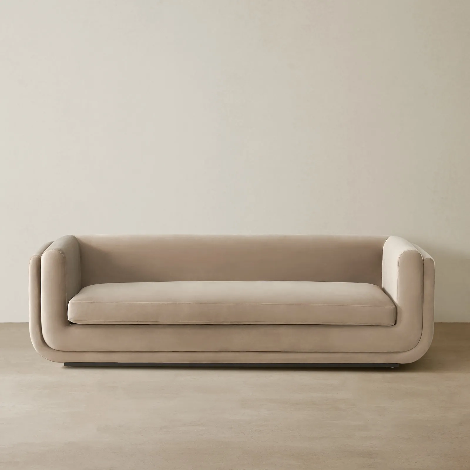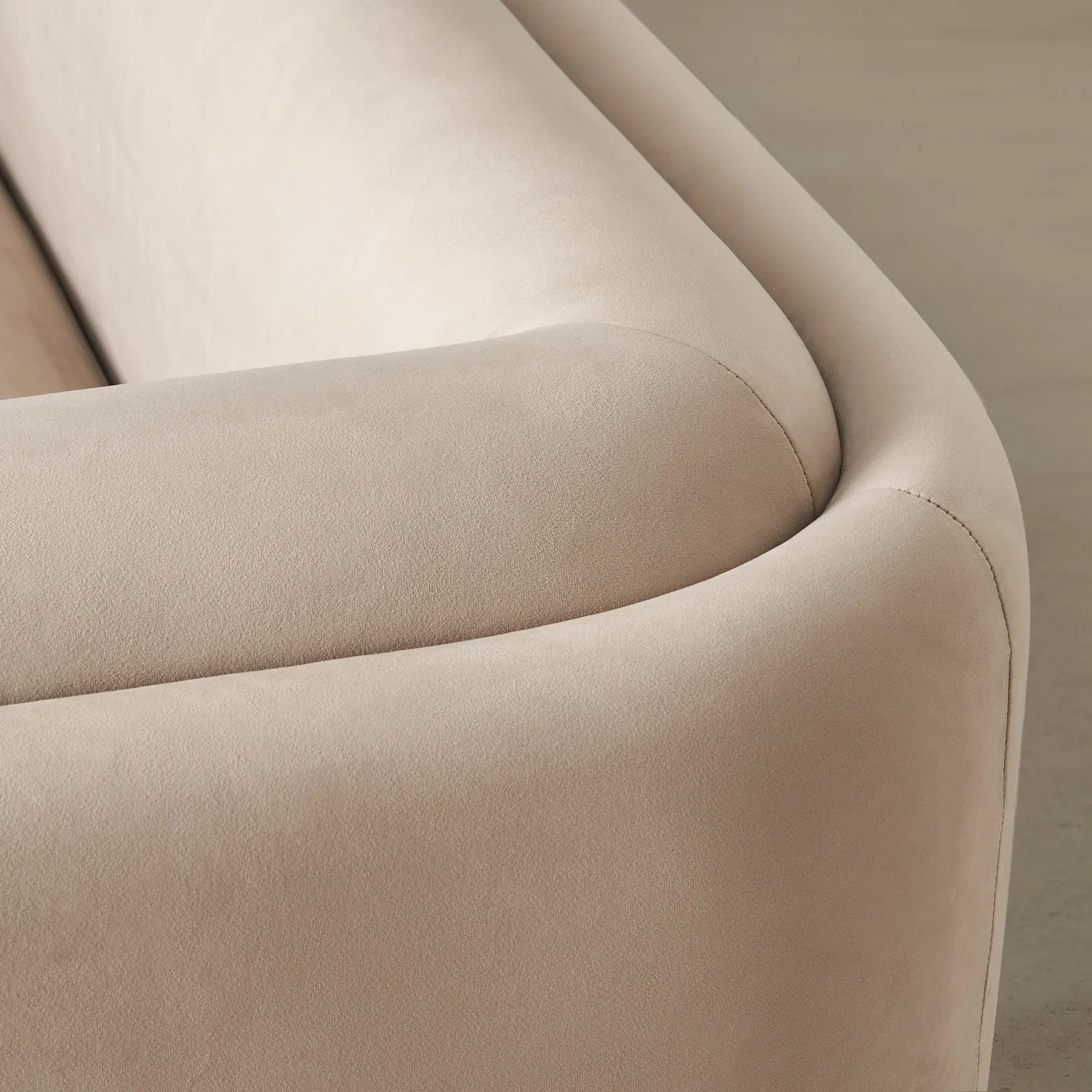 Upholstered in beige velvet, the three-layered cushioning offers both visual appeal and luxurious comfort, inviting you to sink into its soft embrace from any angle.