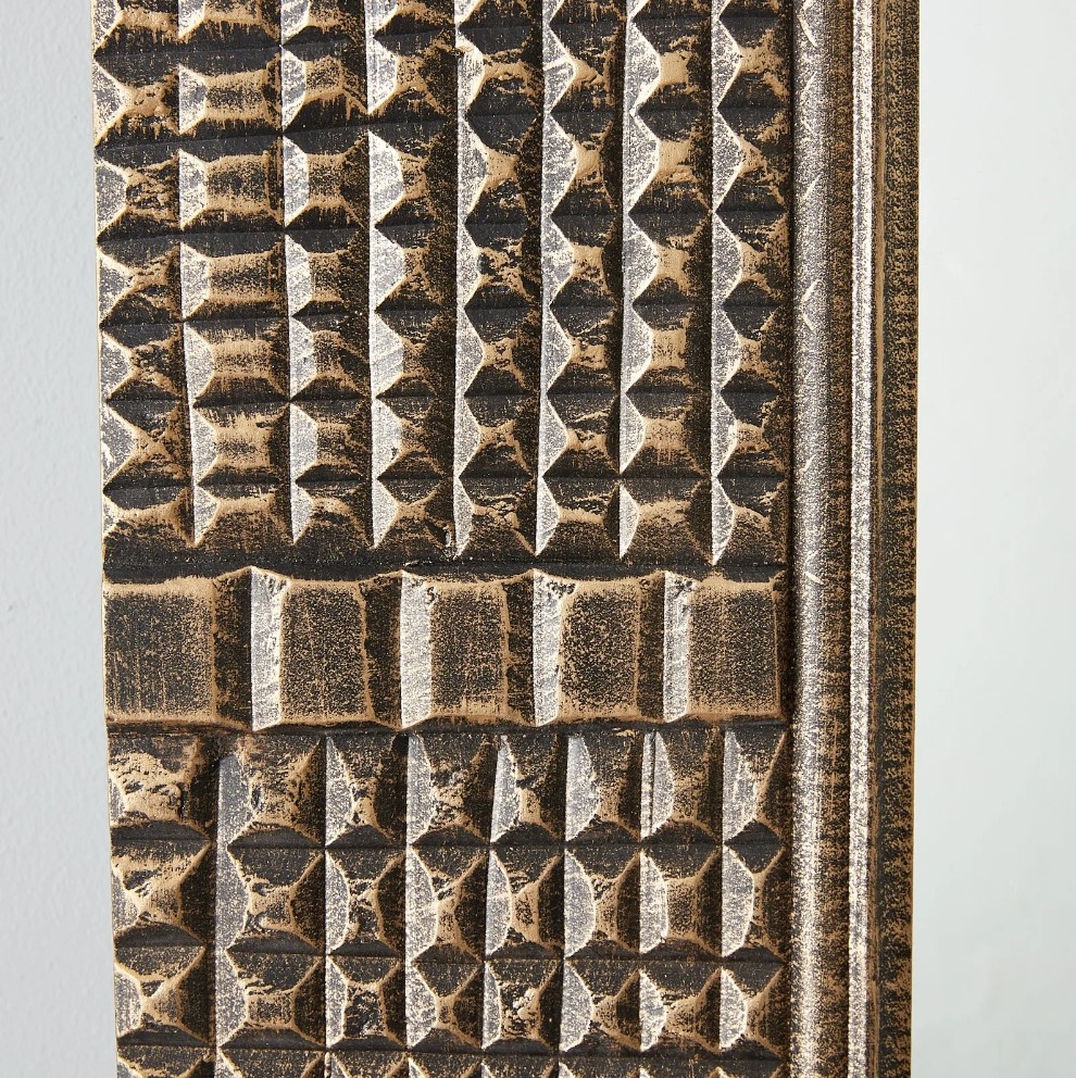 This frame isn't just any frame; it's a celebration of geometry and craftsmanship. Intricate concentric squares in rich black and opulent gold hues cradle the mirror, each layer drawing the eye deeper into its mesmerizing design. The blend of the dark, mysterious black with the luxurious glint of gold creates a visual rhythm, making the mirror not just a functional piece, but a statement of style.