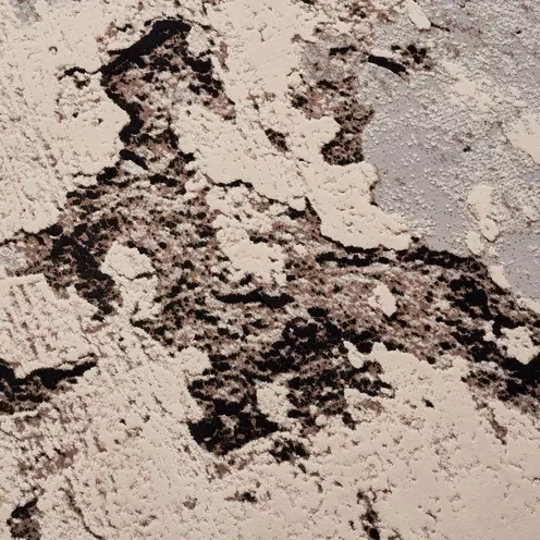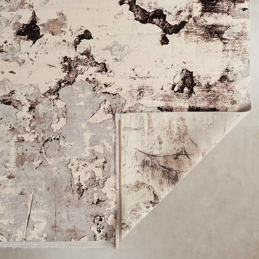 The rug's pattern evokes the look of weathered surfaces, giving it a rustic and organic appeal. This piece brings a sense of tranquility and raw beauty to any room.