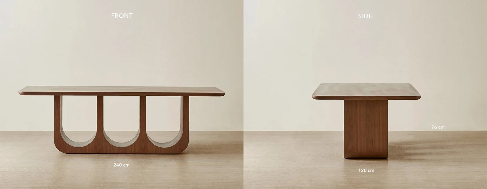 Warmth flows through the rich mocha walnut veneer of the Costanza Dining Table. Its natural grain and tone bring quiet depth to every meal. Its broad 240cm surface rests on a trio of sculptural arches.