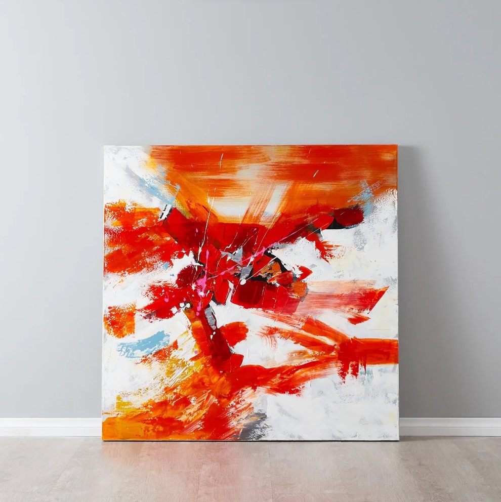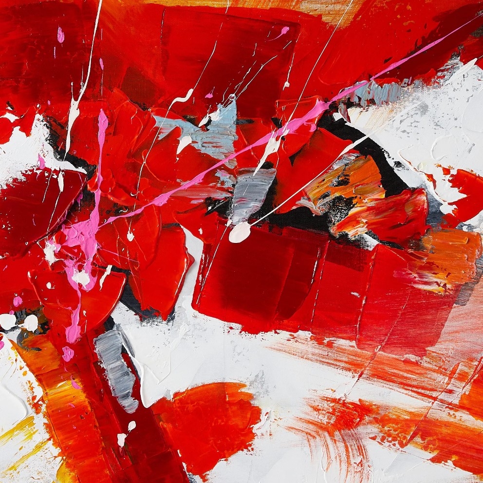 The Crimson Painting is a vivid symphony of color, weaving an arresting tale of passion, energy, and emotion. Each stroke melds hues of red, orange, white, yellow, pink, grey, blue, and black, creating a mesmerizing tableau that seems to pulse with life.
