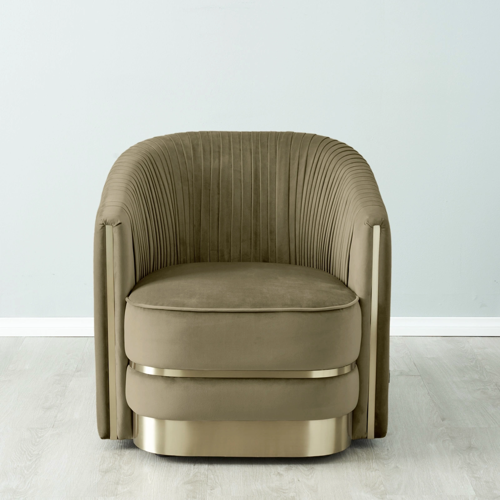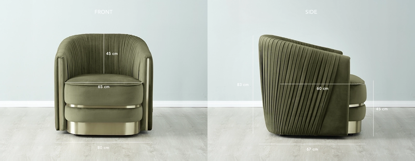 The Crown Olive Green Velvet Occasional Chair exudes luxury with its soft-pile velvet in stunning Olive green, complemented by gold accents for a modern, Art Deco statement.
