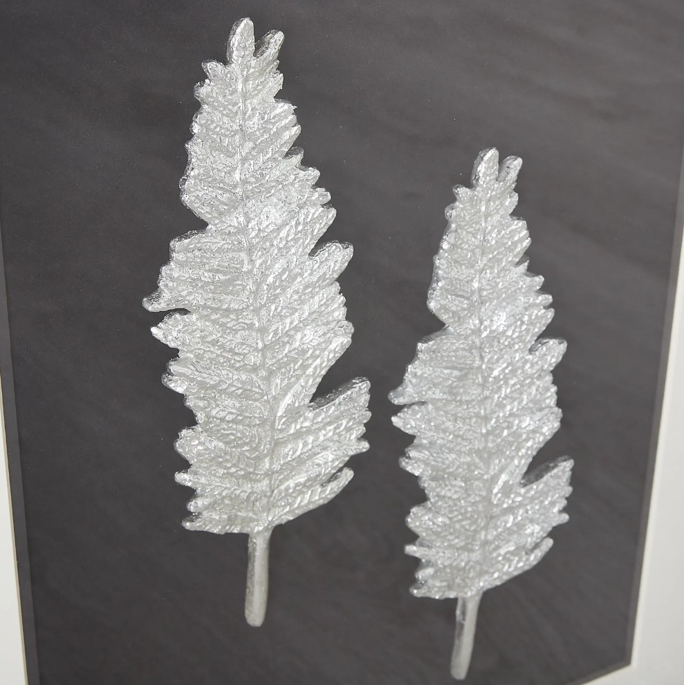The Cycas Silver Leaf Shadow Box is a testament to timeless elegance, showcasing two refined silver Cycas leaves beautifully encased within a sophisticated champagne-hued frame. Its harmonious blend of colors serves as a radiant focal point, effortlessly brightening and enhancing any space it graces.