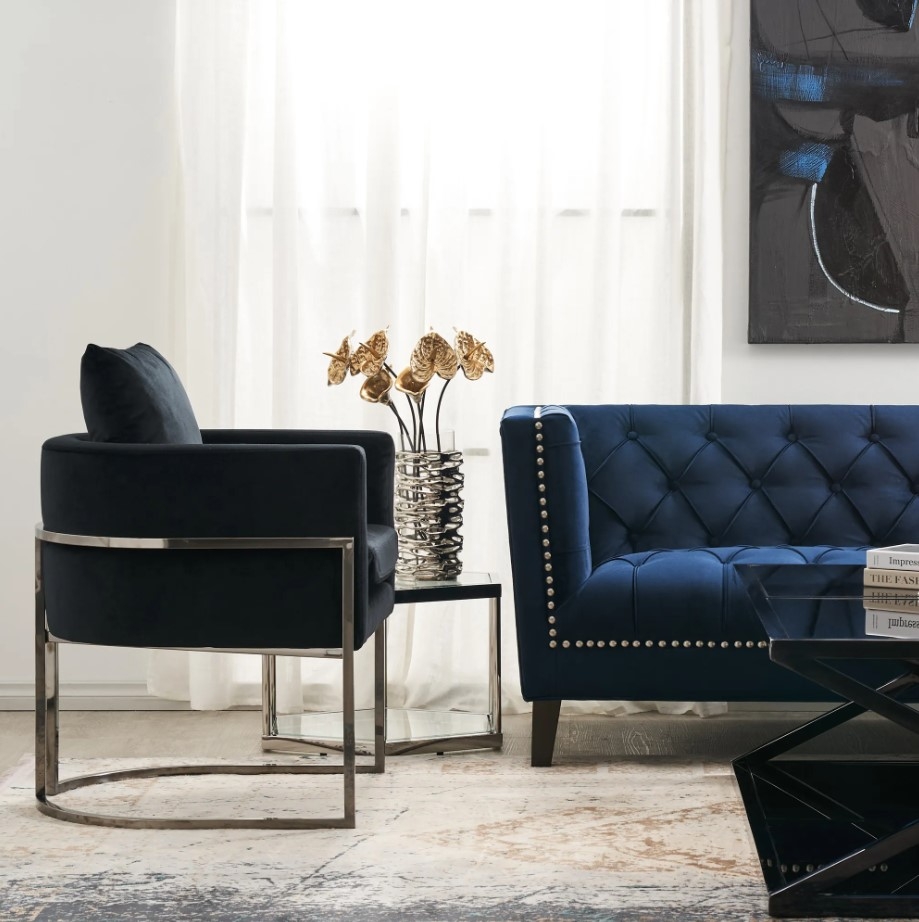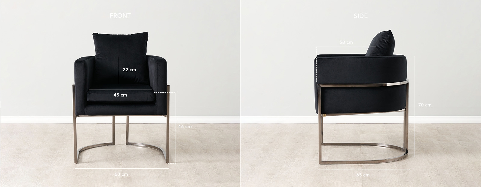A black nickel stainless-steel frame adds stability and visual appeal to the Cynthia Chair, complementing its black velvet upholstery. Each chair includes a matching velvet pillow, and multiple colour options are available.