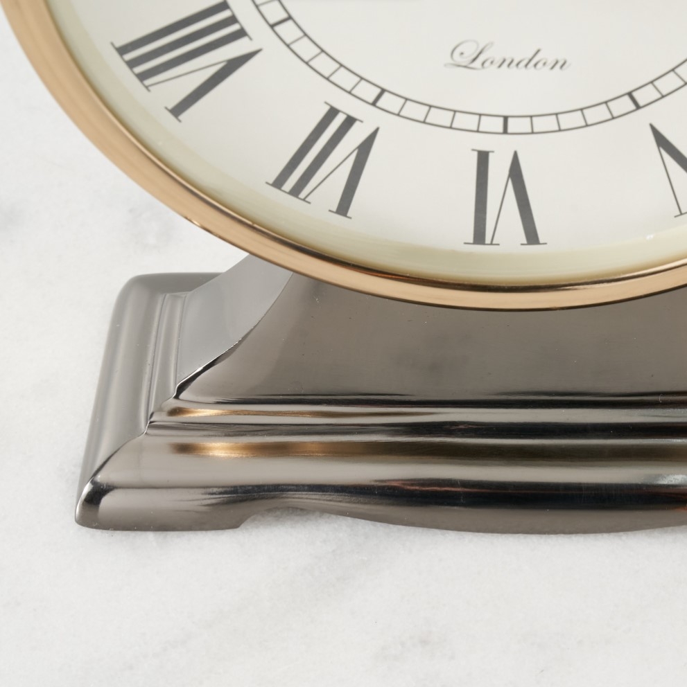 Introducing the Dalbert Clock, a timepiece that melds form and function in an elegant dance. This circular clock, gracefully poised upon a silver-coloured stand, appears as if it's being presented to the beholder, exuding an air of distinction. Its upper circular border glistens with a brass-coloured lustre, creating a harmonious contrast with the sleek silver stand beneath.