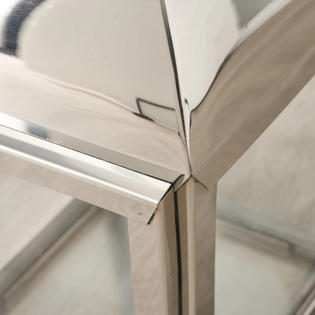The frame, resplendent in a silver lustre, contrasts beautifully with the clear glass panels, ensuring that your light beams brilliantly in all directions. Not just a functional item, the Damien Lantern is a statement piece. The lustrous silver frame, complemented by the warm brown handle, adds a touch of sophistication to any setting, whether it's placed indoors or out.