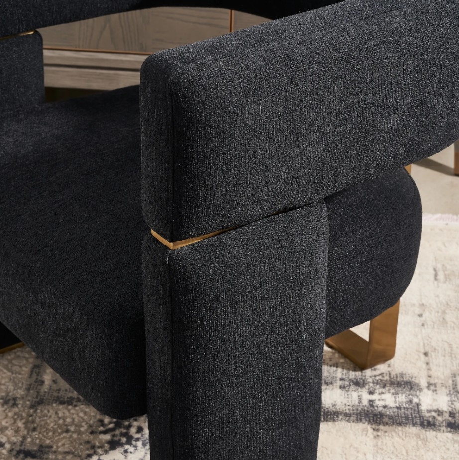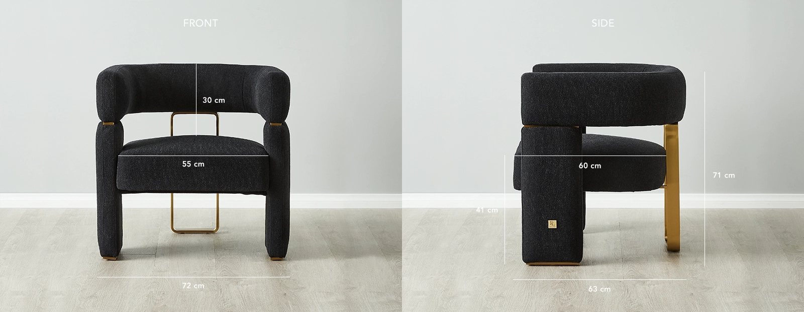 The Daniella features sophisticated black woven fabric upholstery complemented by a striking golden-coloured stainless steel frame, enhancing its luxurious lustre and elegance.