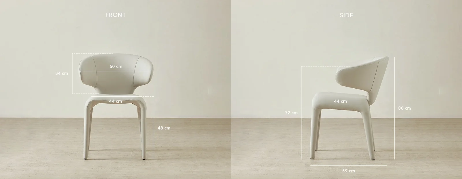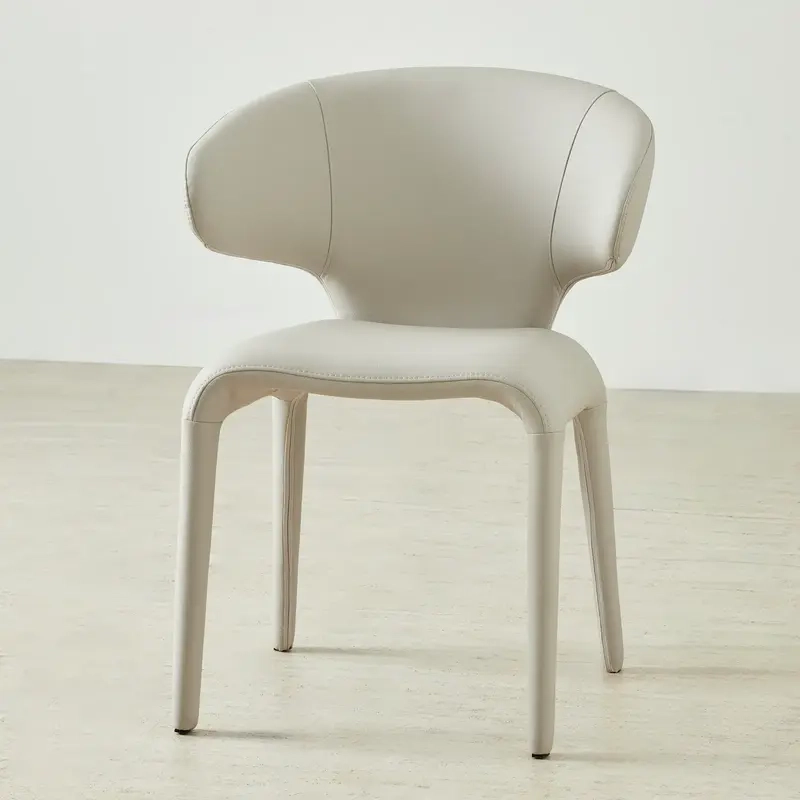 The Debra is a statement in vegan leather. This dining chair wraps its smooth curves in Glacier Grey, offering a refined blend of texture and sculptural form.