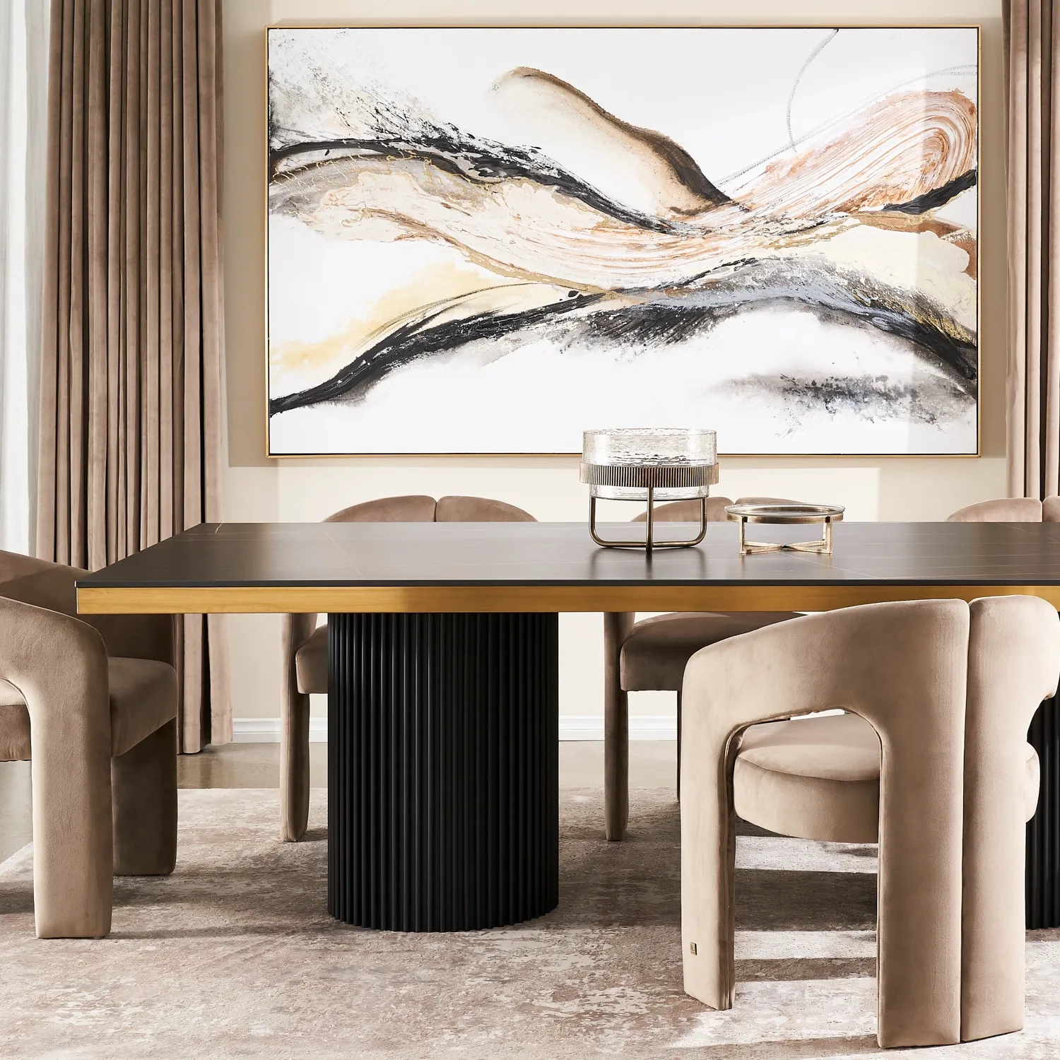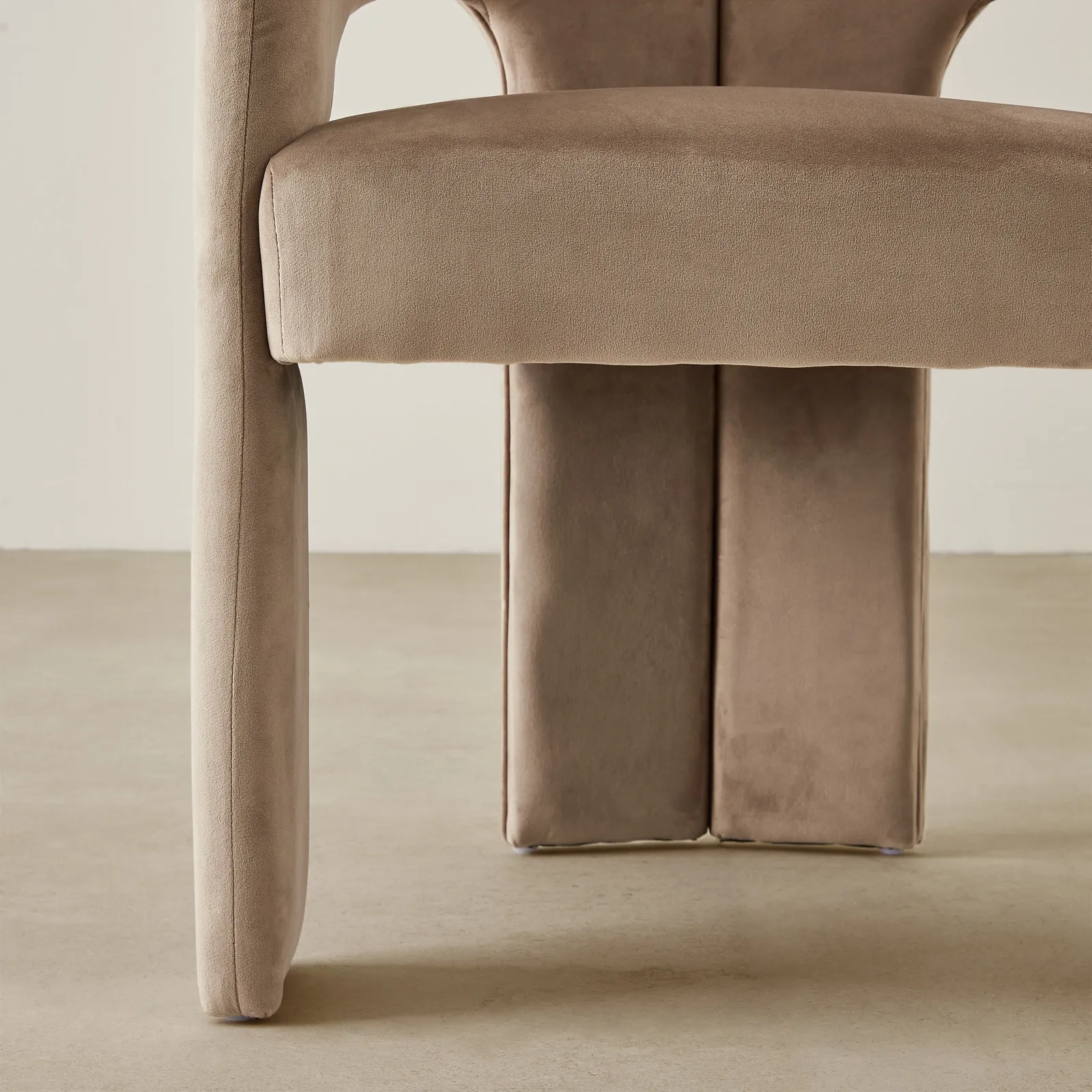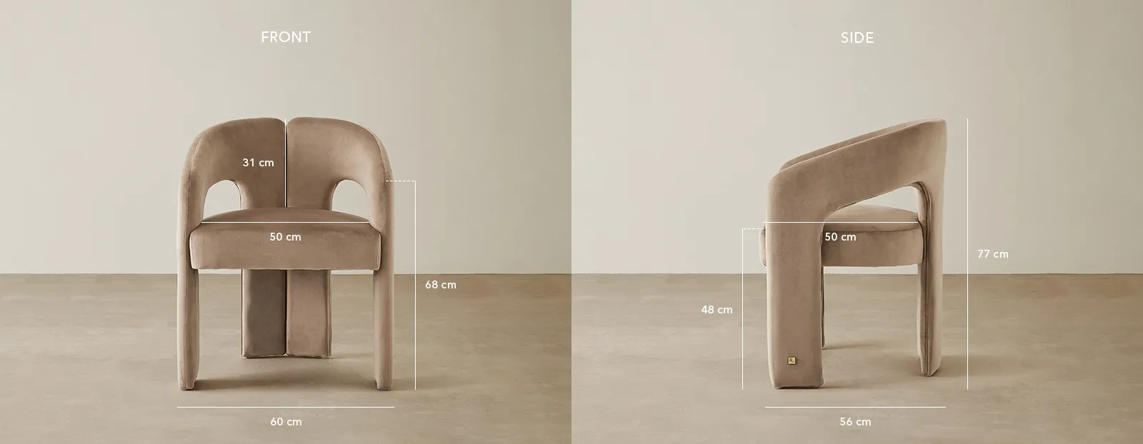 Add modernity to your dining area with the Delaney Dining Chair. This piece is draped in beige coloured velvet fabric. featuring a frame with a distinct halved back design. the delaney is truly an eye catcher.