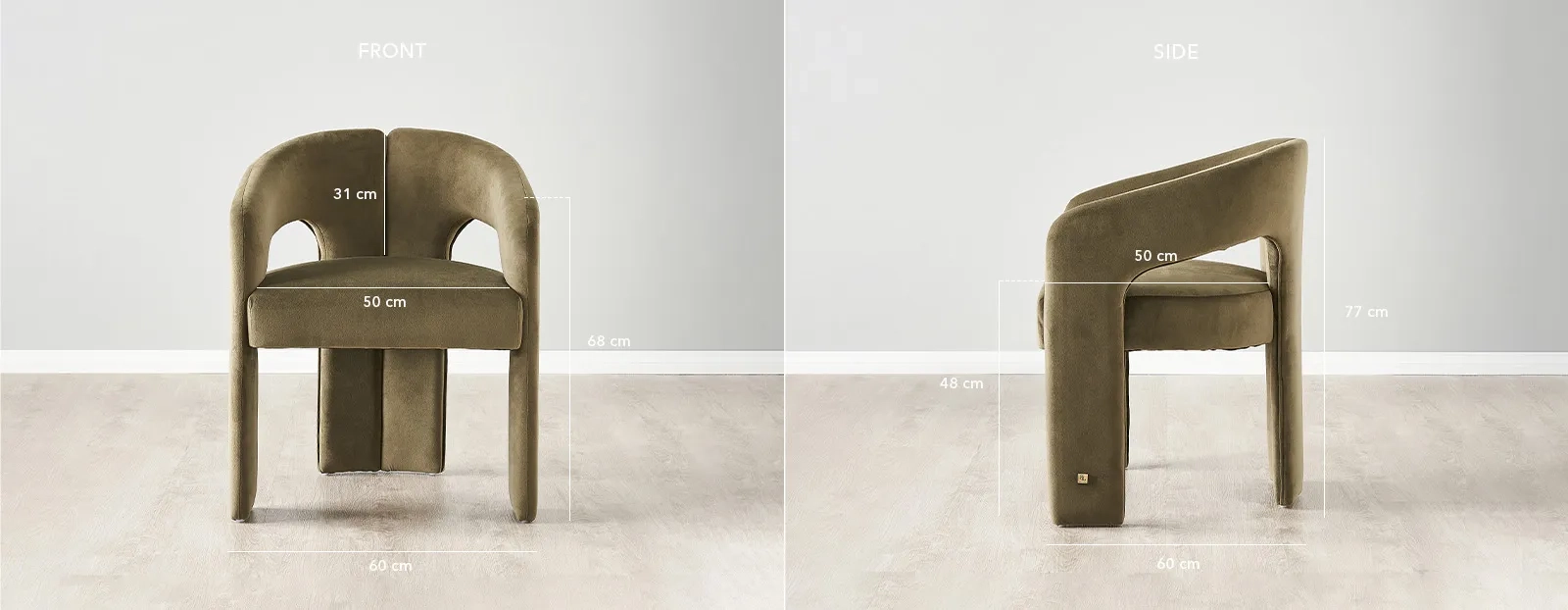 Introducing the Delaney Dining Chair, an epitome of modern sophistication wrapped in the luxurious embrace of velvet. This chair is designed to be more than just a seat at the table; it is a statement of style and comfort. The sleek, curved silhouette is a visual delight, expertly crafted to capture the eye and invite guests to sit and savor. Its sumptuous velvet upholstery, in a deep Olive Green coloured shade, is soft to the touch and lends an air of opulence to any dining setting.