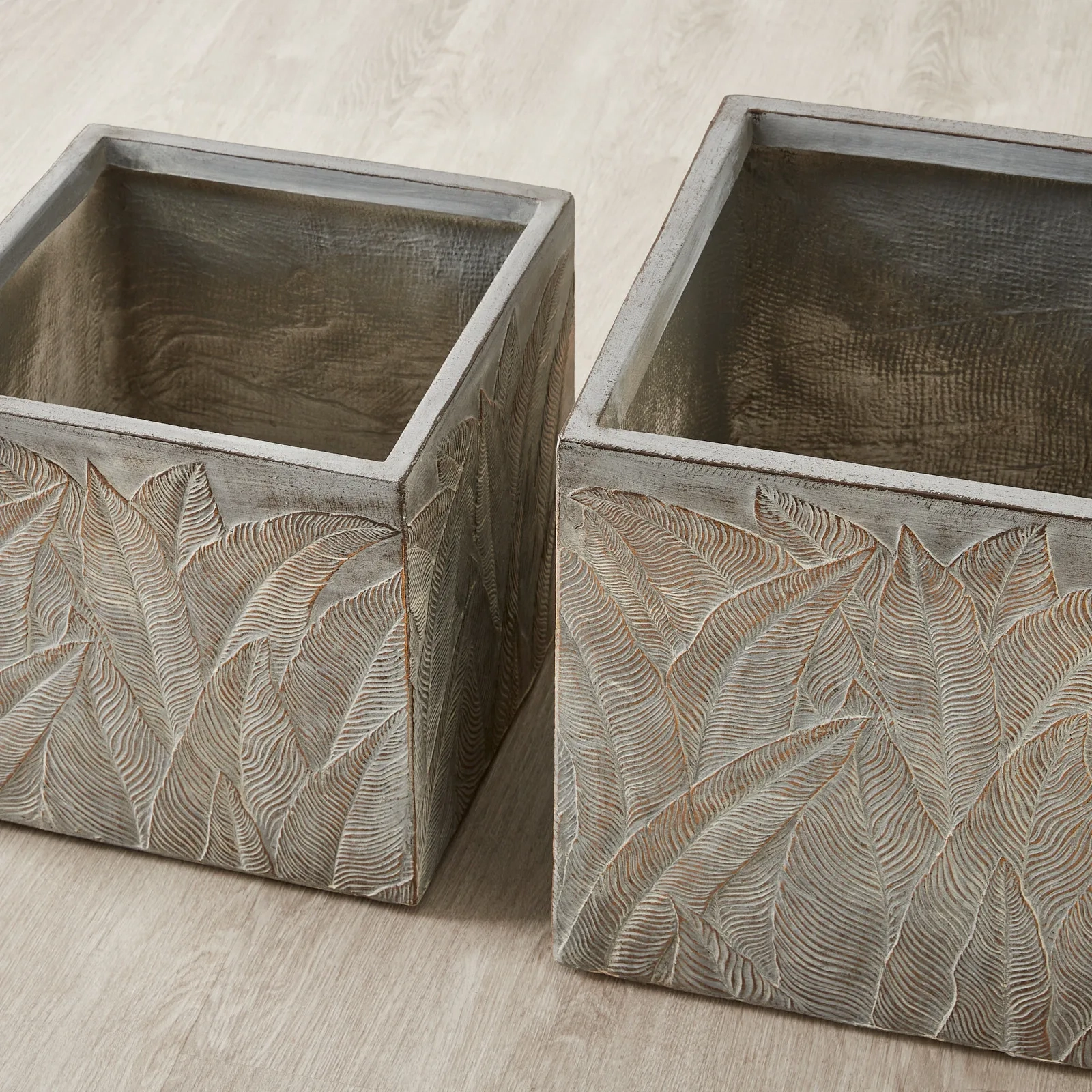 The Delilah features two square fibre Clay planters etched with detailed leaf motif.