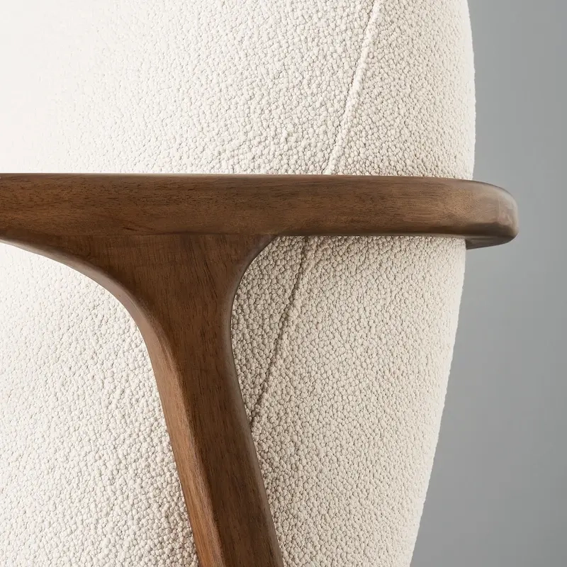 The Delphine balances simplicity and presence, with subtle details that highlight its sculpted wooden frame. Slender arms and a smooth finish give the chair both structure and timeless strength.