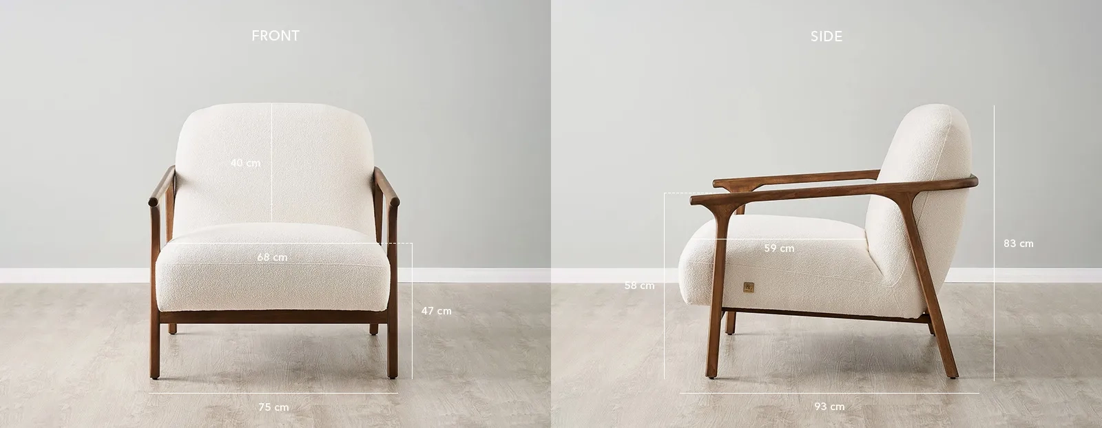The Delphine pairs a rounded, low-slung seat with a softly curved back. Upholstered in Chantilly white fabric, it brings a bright, textured look that feels both relaxed and refined.