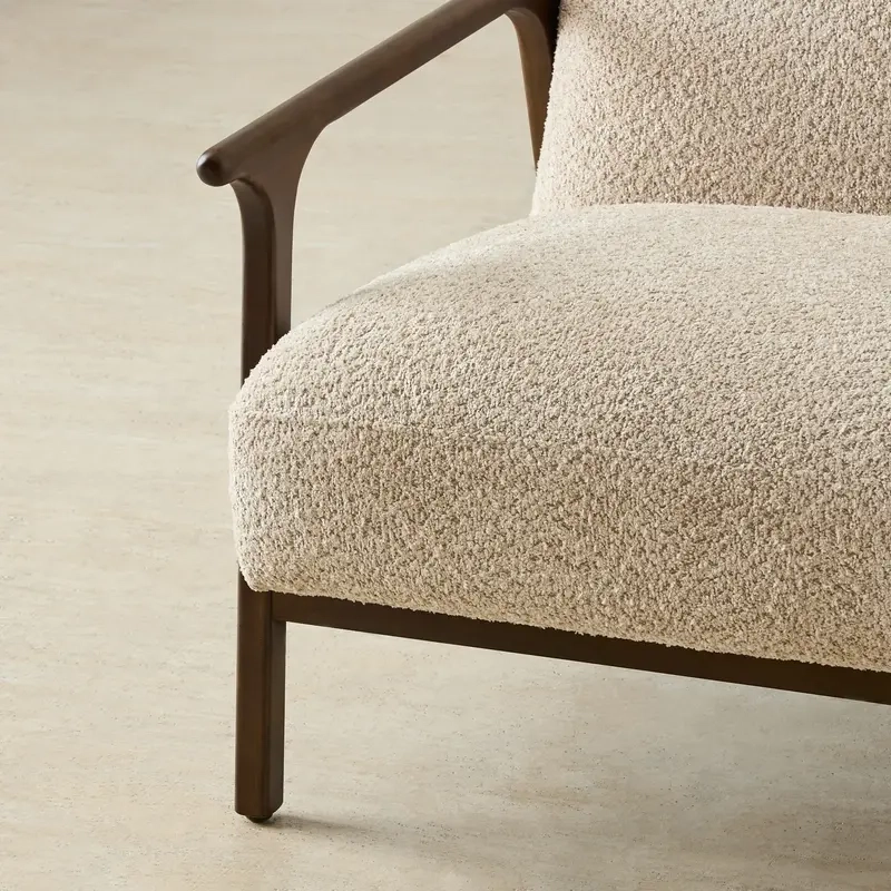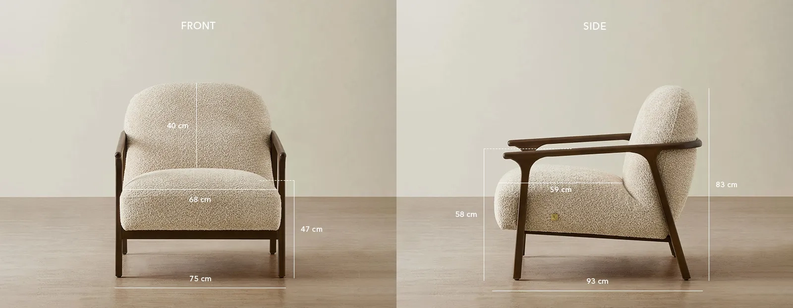 Balancing simplicity and presence, the Delphine’s sculpted wooden frame with slender arms highlights subtle detailing. Its smooth finish gives the chair both structure and timeless strength.