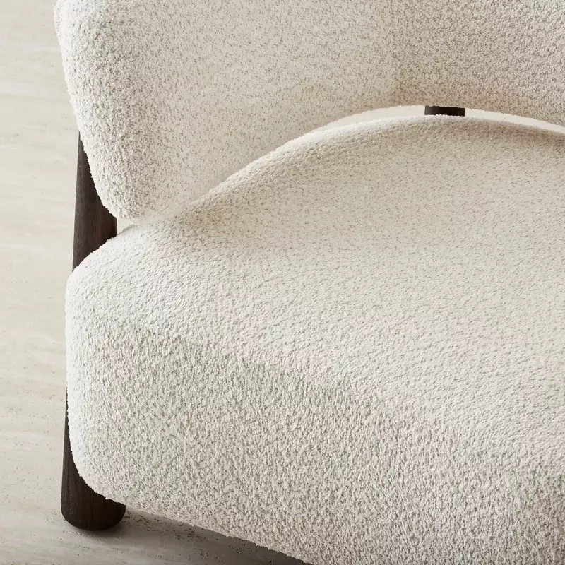 The Dolores Stone Cream Fabric Occasional Chair combines a rounded, supportive backrest with soft cream fabric and dark wood legs, blending comfort with modern style.