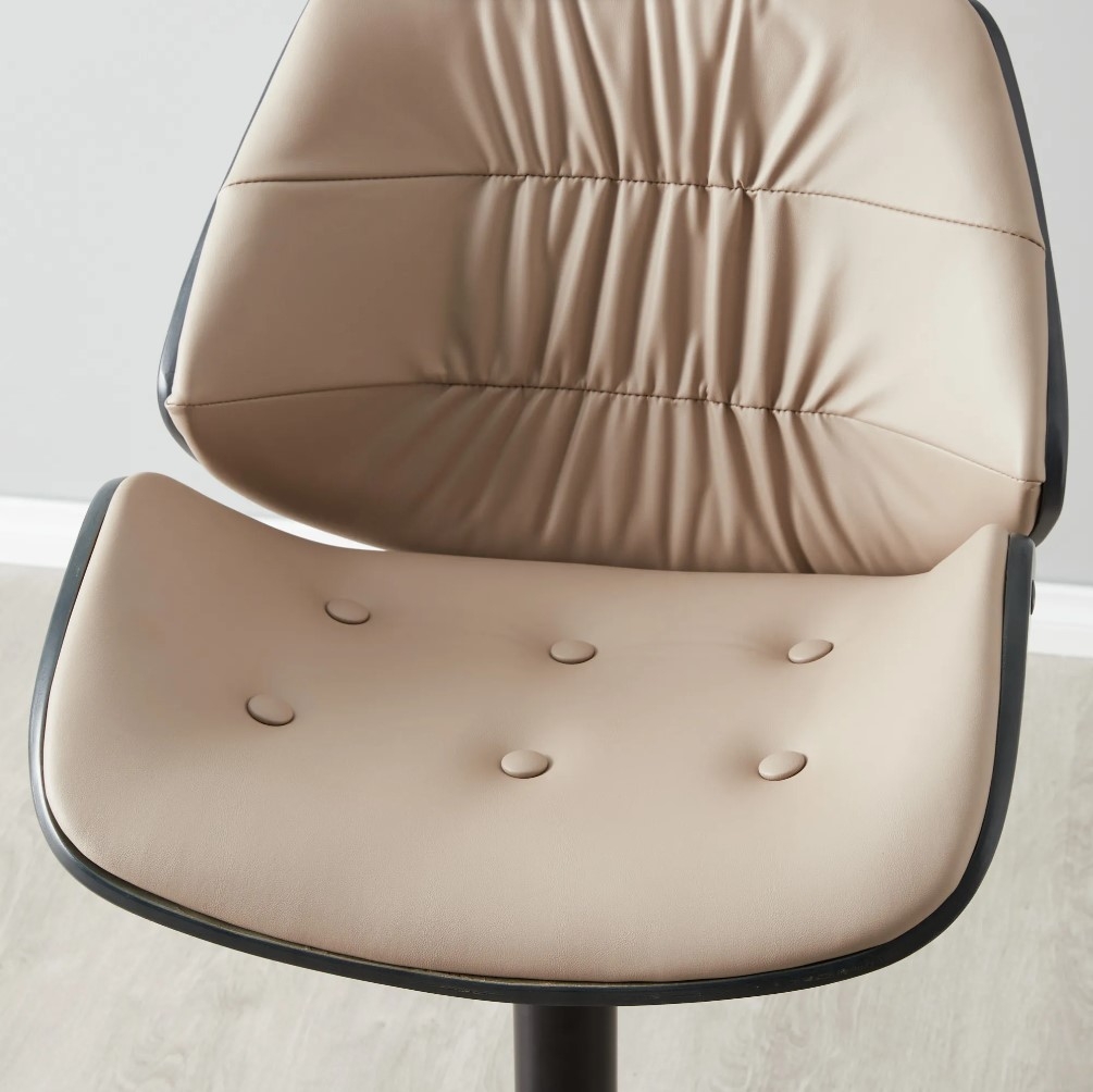 Wine and dine in style with the Draco Sand Beige Vegan Leather Bar Stool, featuring premium vegan leather in a sophisticated sand beige shade. Its angled backrest, horizontal stitching, and tub-inspired design add both comfort and visual appeal to any dining space.