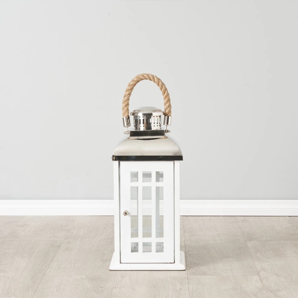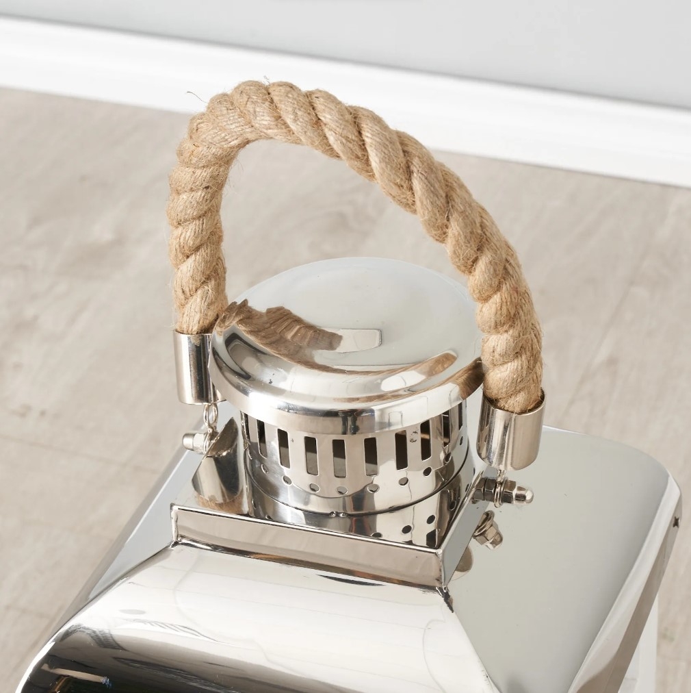 Adding a rustic touch, a creatively knotted rope handle contrasts beautifully with the sleek silver-coloured exhaust that lends a distinct shine to the piece. Available in both small and large variants, the Draven Lantern is versatile and suitable for various spaces in your home. Whether placed indoors or under cover outdoors, it promises to add a warm and inviting glow to your surroundings.