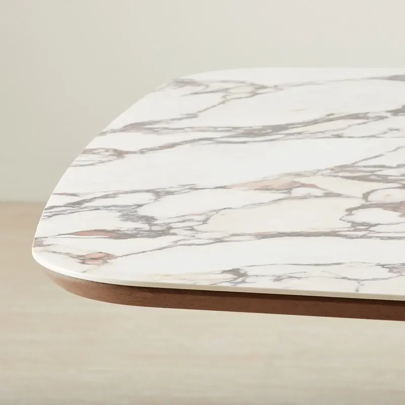 The Dunstan Dining Table presents a striking rectangular form with curved edges that draw the eye with its refined surface. The rich veining of the sintered stone top creates an impression of timeless elegance, enhancing the dining space with visual depth.