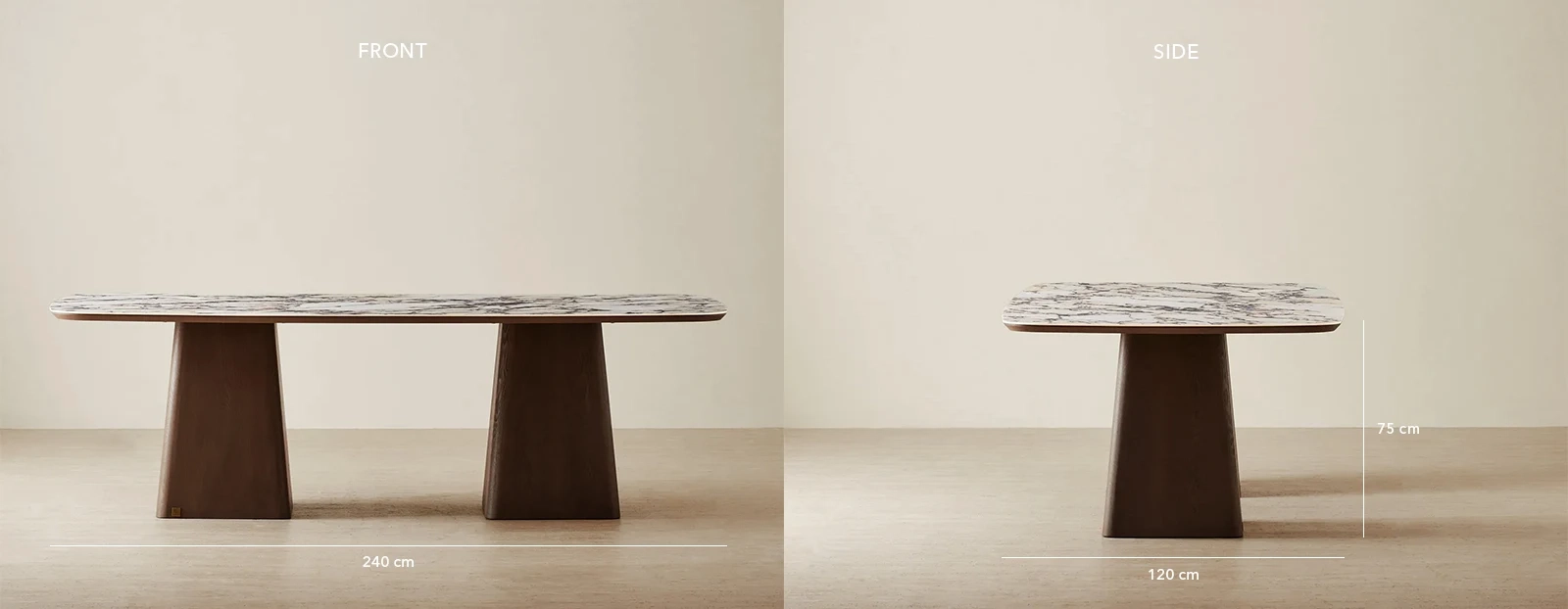 Its two column-shaped, geometrical wooden legs are beautifully crafted, adding sculptural interest and sturdy support. This dining table serves as a standout centerpiece that elevates the dining experience.