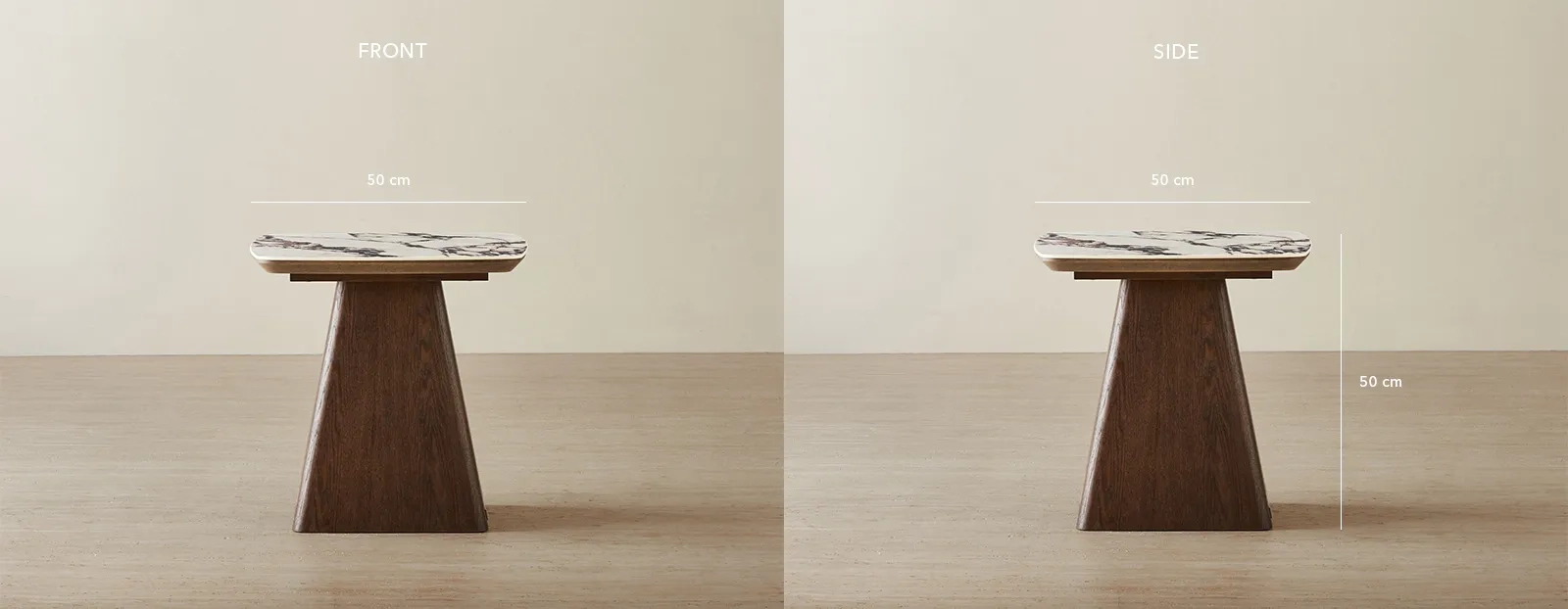 The Dunstan Side Tables feature a striking square design that captivates with their refined surfaces. The rich veining of the sintered stone adds timeless elegance, bringing visual depth to any space.