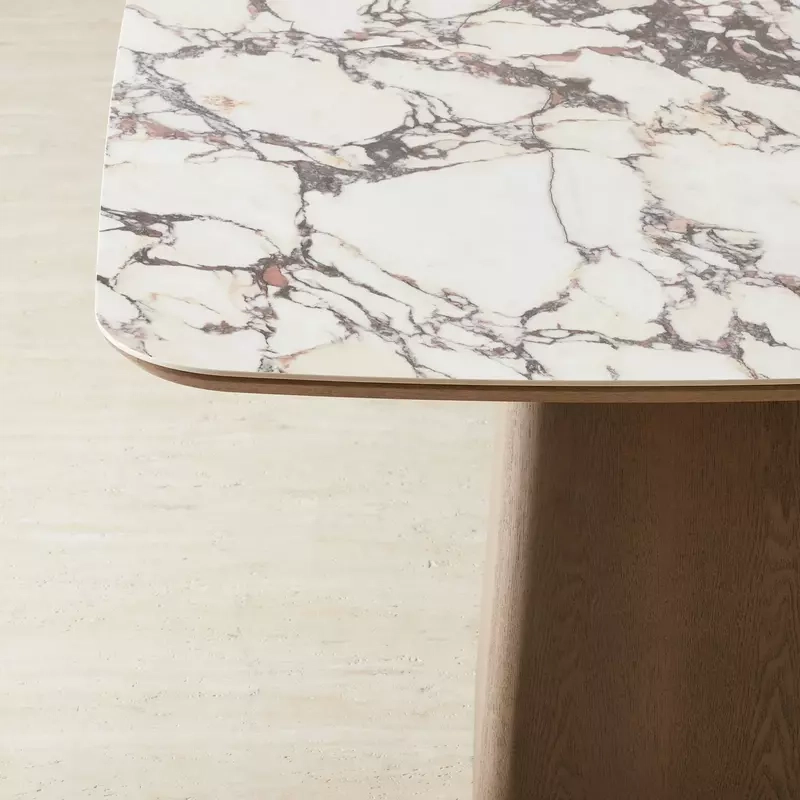 Dunstan Calacatta Viola Sintered Stone Rectangular Dining Table - Medium Brown Wooden Legs
