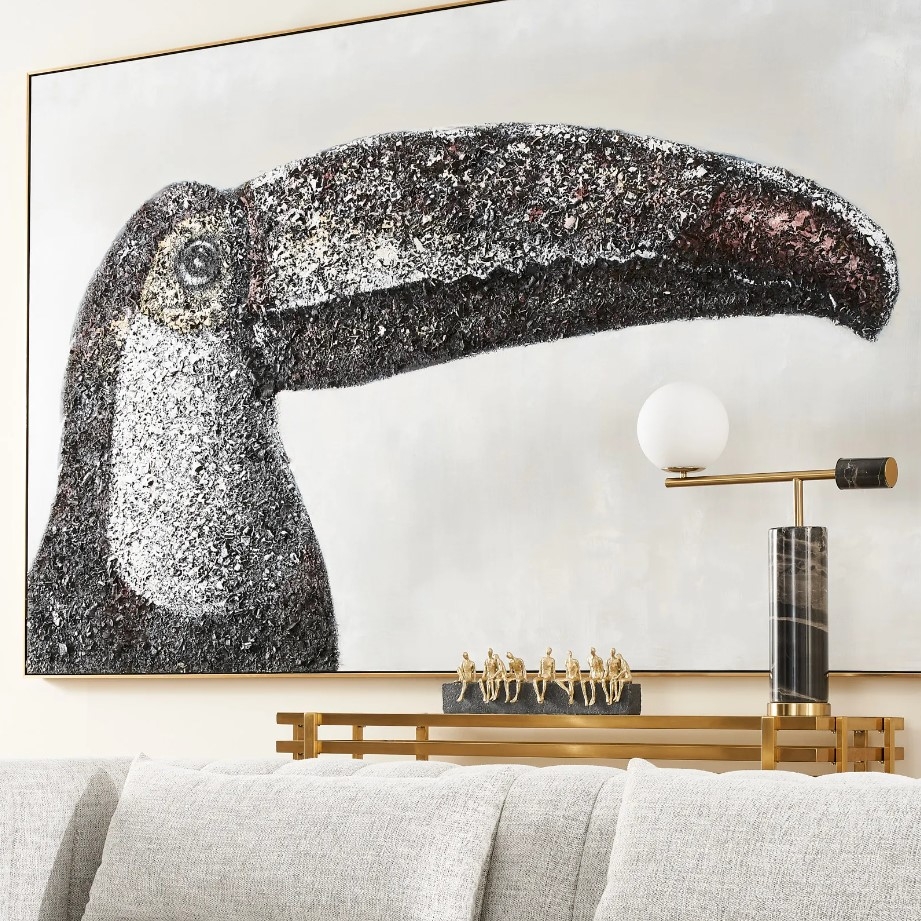 The Earth-toned Toucan Painting is a captivating artistic representation of one of nature's most majestic creatures. In this piece, the artist chooses to diverge from the typical, vibrant depiction of toucans, instead opting for a palette dominated by dark and earthy tones. This choice in coloration not only highlights the toucan's unique features in a new light but also imbues the artwork with a sense of groundedness and natural elegance.