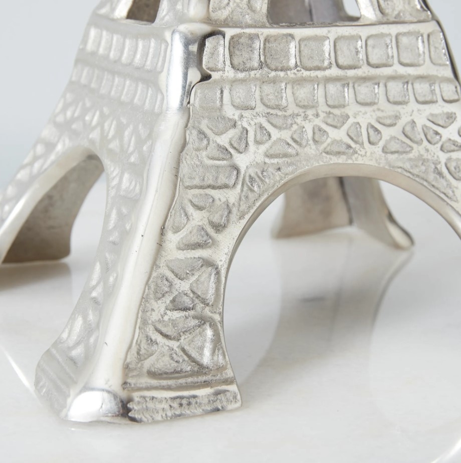 Made from finely crafted aluminum, this sculpture masterfully mimics the iconic steel lattice structure of the original Eiffel Tower, bringing a touch of Parisian charm to your tabletop or mantelpiece. Cloaked in a gorgeous silver coloured shade, this piece is a subtle yet captivating addition to any space.