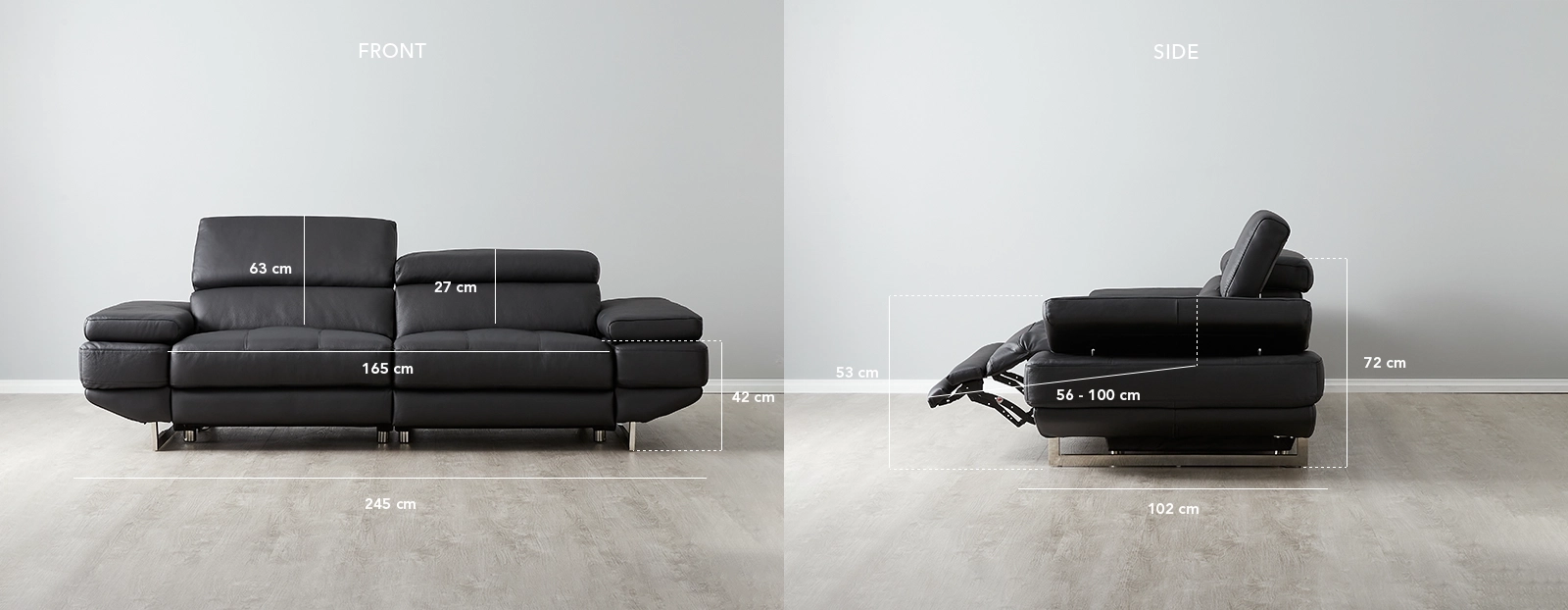 Feel the day's worries melt away as dense foam cushions cradle you, while Elena’s electric controls let you adjust the head and footrests with ease. For added comfort, the adjustable sides and discreetly integrated reclining mechanism offer a seamless, personalized relaxation experience.