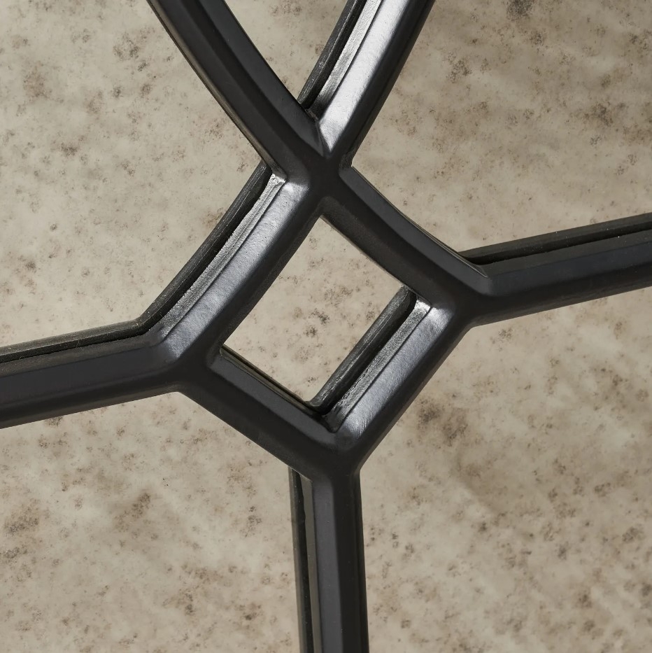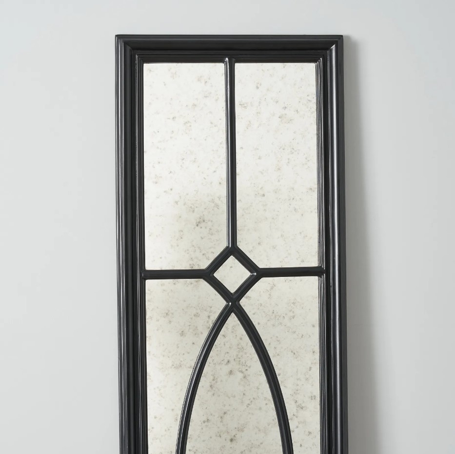 The frame itself is crafted from high-quality wood, finished in a deep black that evokes a sense of timeless grace. The contrast between the black frame and the luminous mirror surface creates a striking visual balance, making this piece a versatile addition to any room.
