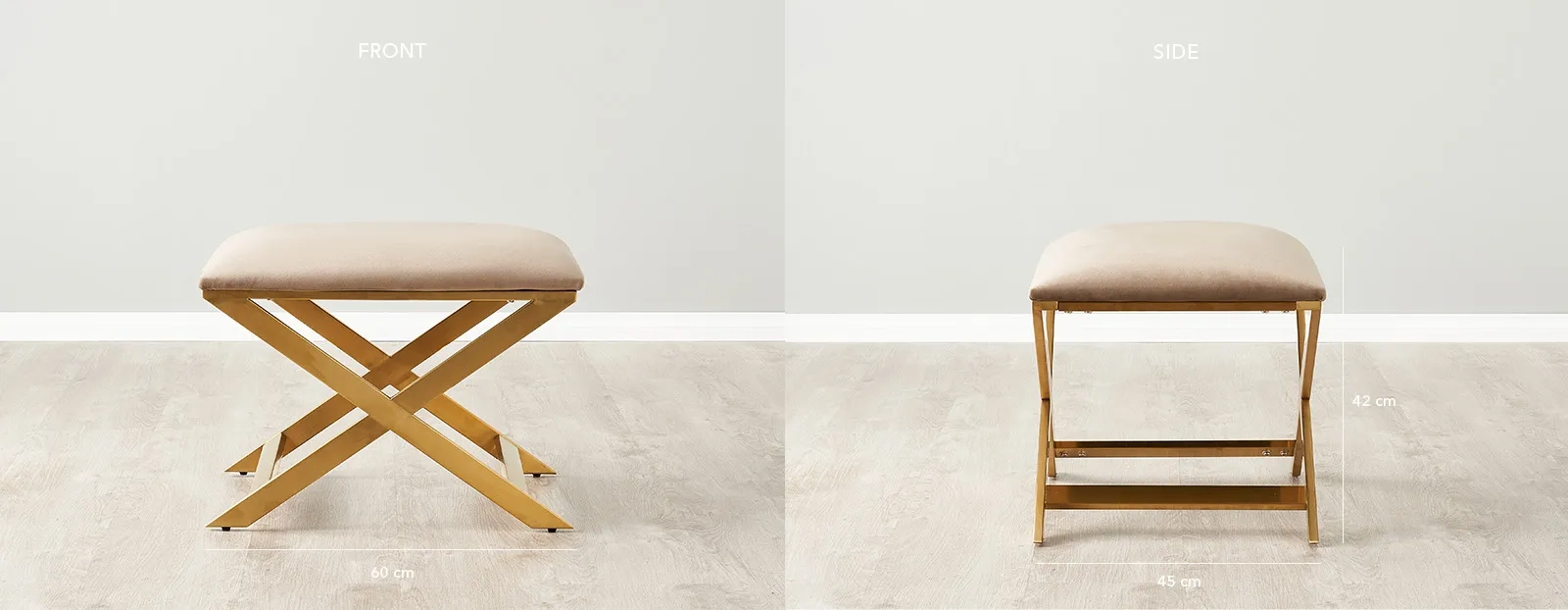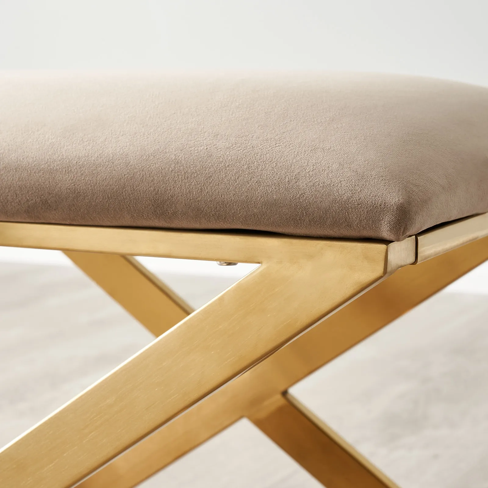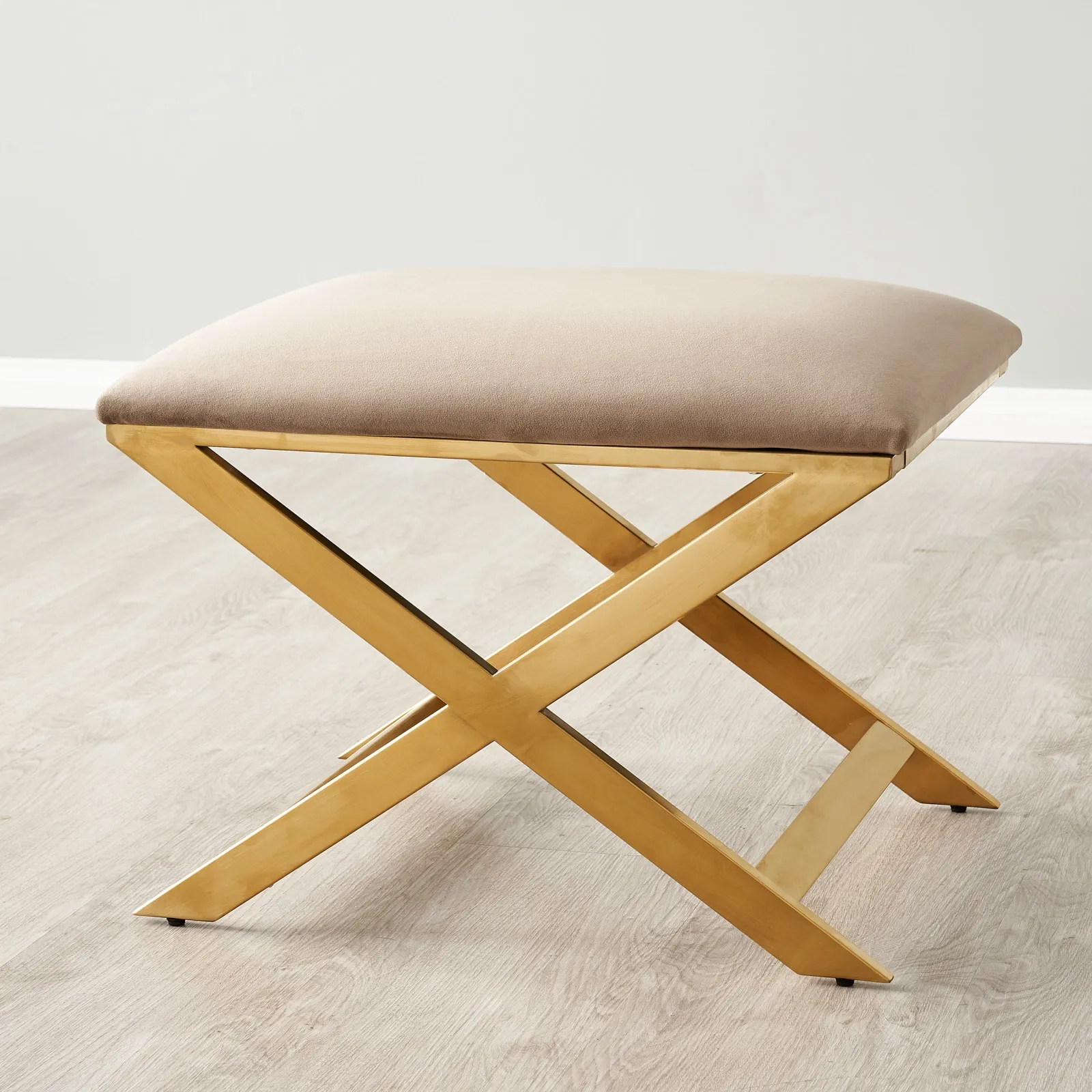 The Elle Beige Velvet Ottoman is the epitome of understated elegance, blending plush comfort with a clean, contemporary design. Upholstered in a sumptuous beige velvet, its surface invites touch with a softness that promises luxury. This ottoman is gracefully supported by a crisscross base of gleaming gold-finished legs, their metallic sheen offering a striking contrast to the muted tone of the velvet.