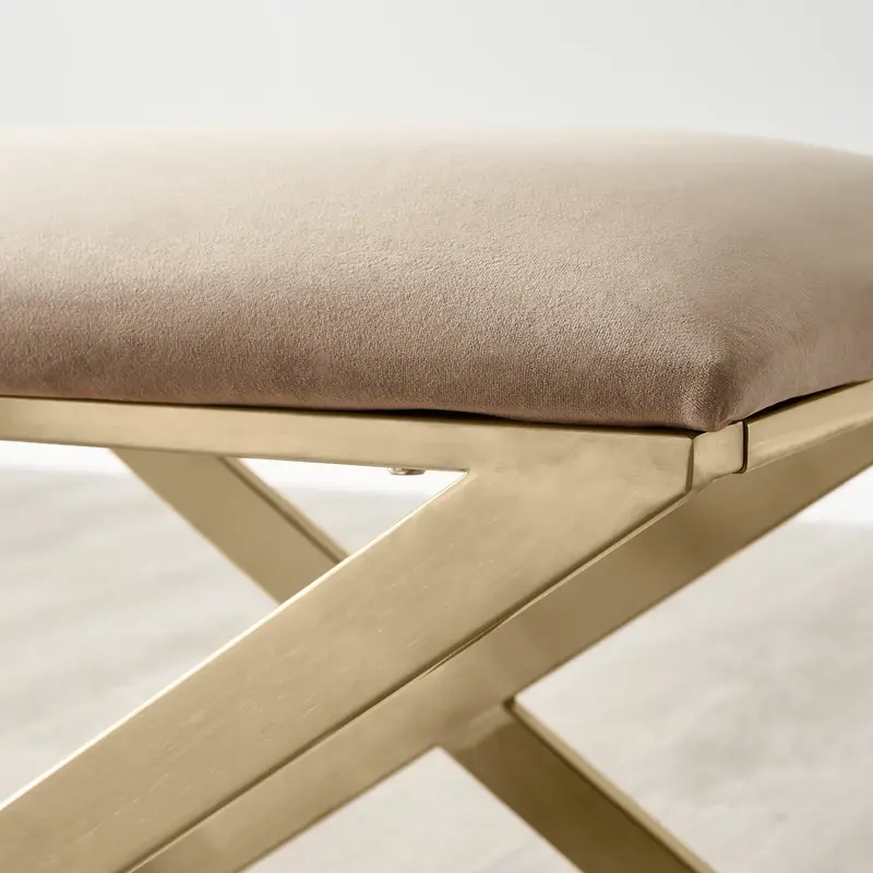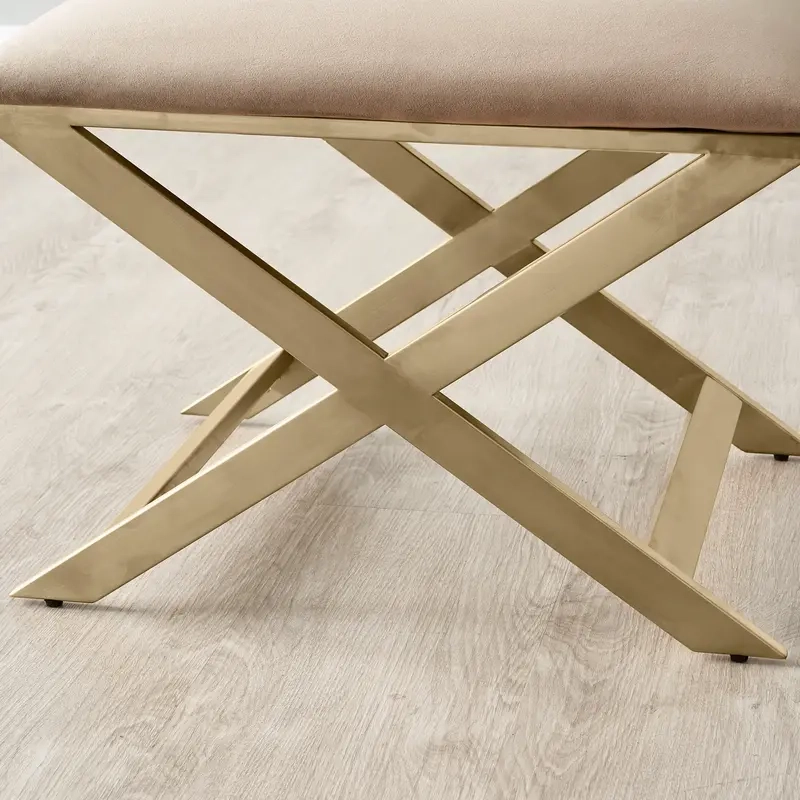 The Elle Beige Velvet Ottoman combines comfort with a clean, modern design. Upholstered in beige velvet and supported by a champagne gold-finished base.