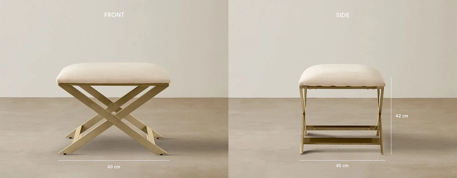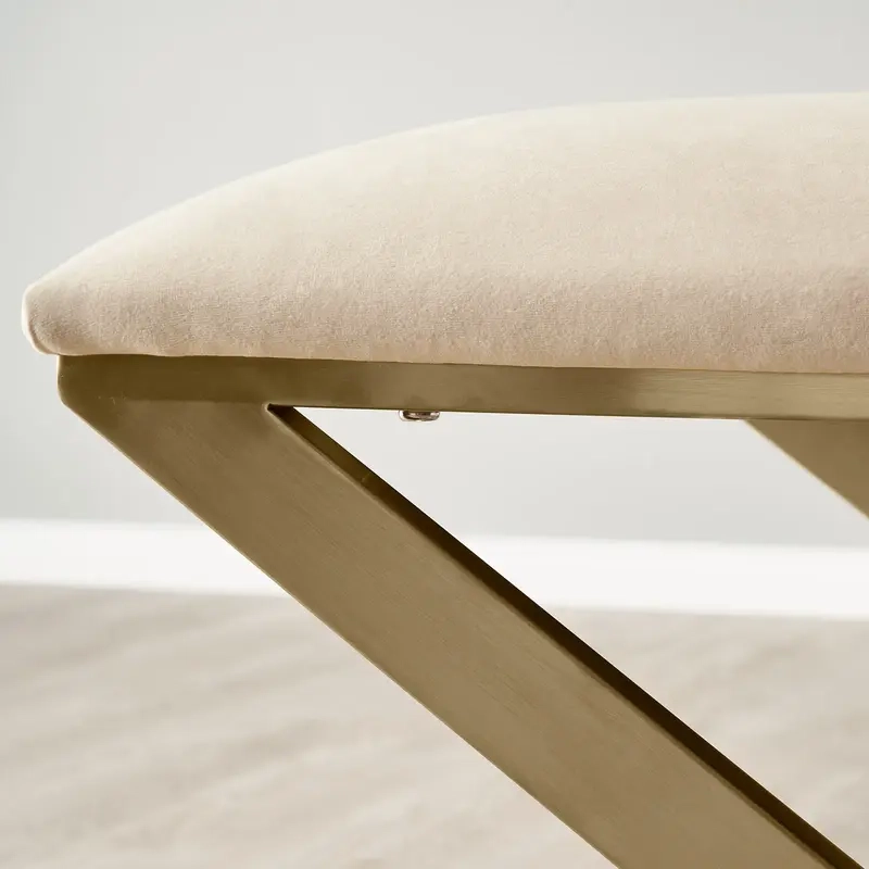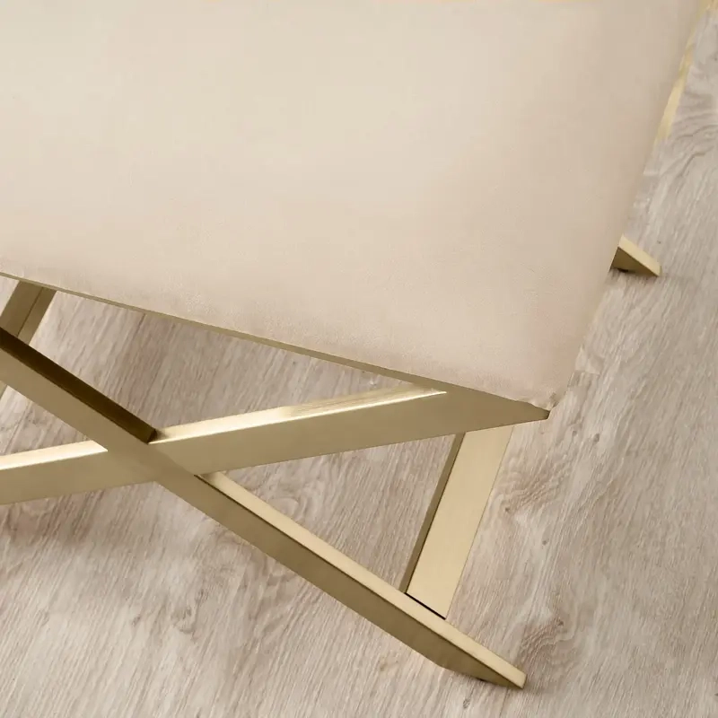 The Elle Beige Velvet Ottoman combines comfort with a clean, modern design. Upholstered in beige velvet and supported by a champagne gold-finished base.