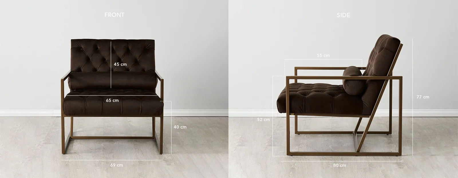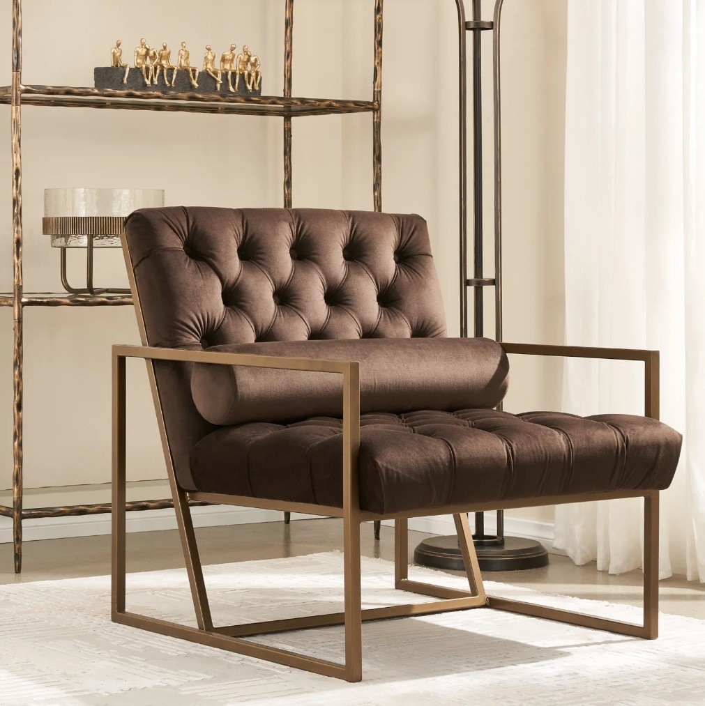The chair’s diamond tufts not only secure the fabric but also enhance its plush appearance. A brass-coloured steel frame provides sturdy support, while the slightly angled back ensures comfort for reading or lounging.