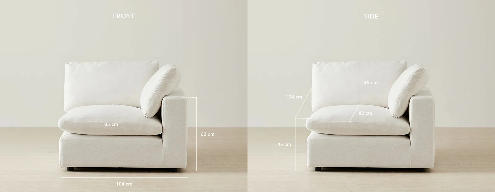 The defined arm anchors the piece, perfect for corner configurations or open modular setups. Simple, soft, and versatile designed to suit evolving interiors.