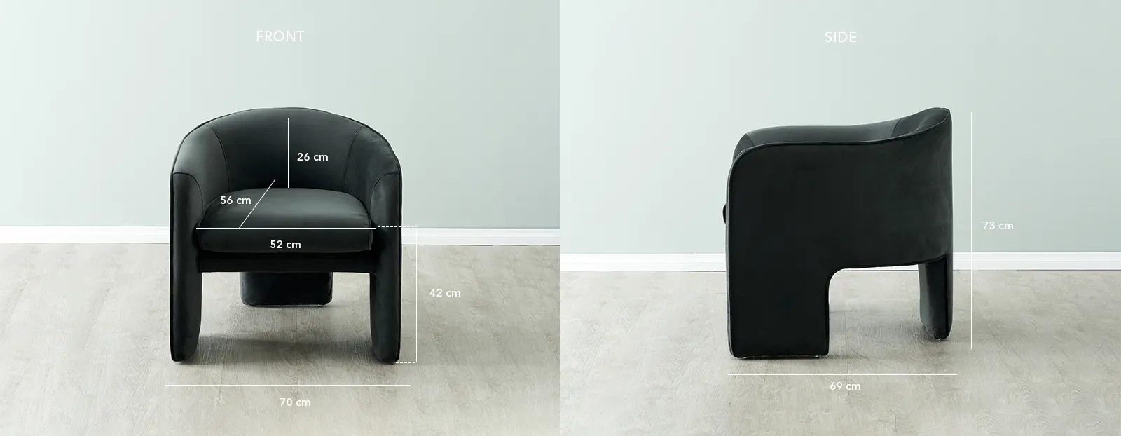 The Esther Charcoal Velvet Armchair combines modern design with a sleek charcoal velvet finish, offering both comfort and style. Its curved frame and open base design create a contemporary look that suits any space.