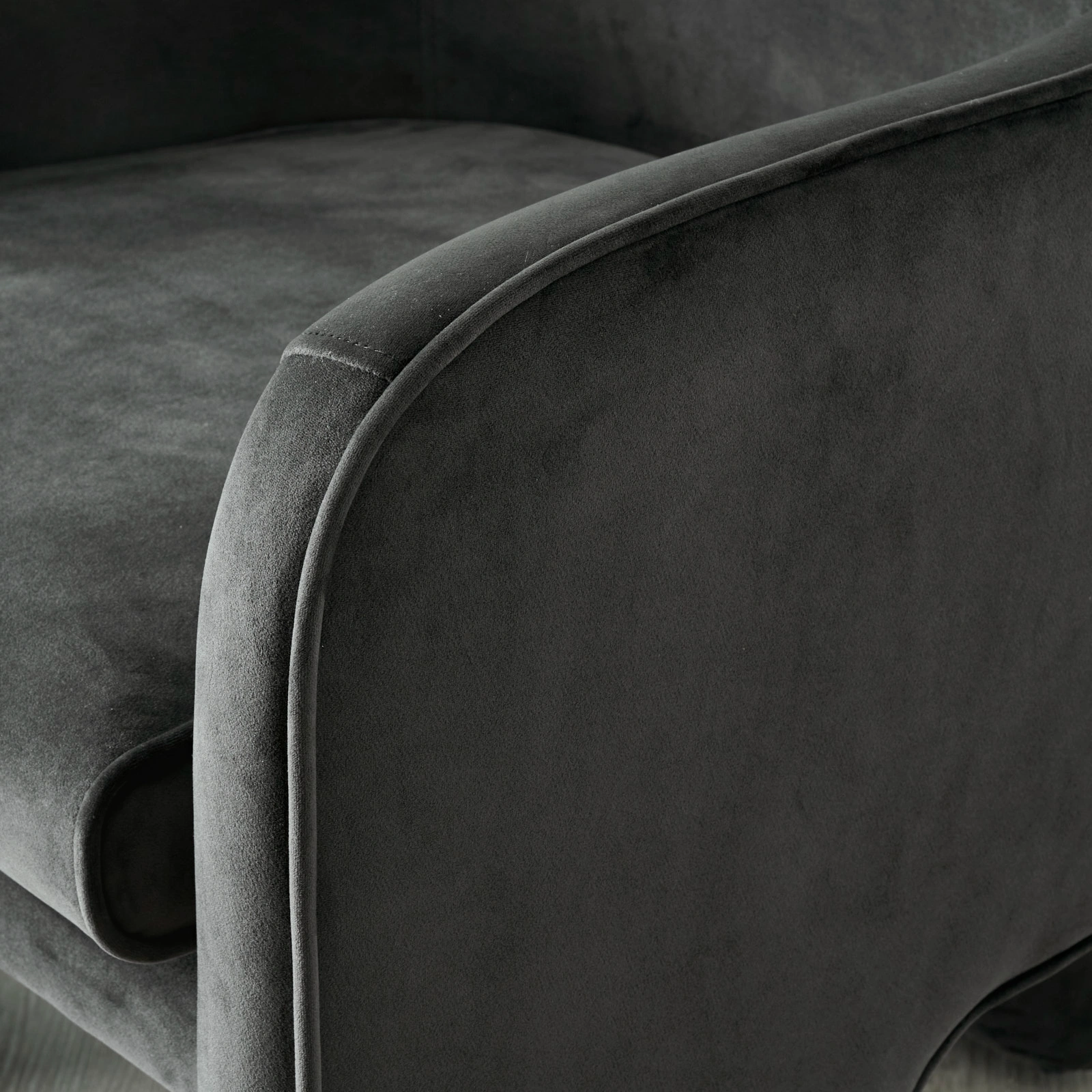 The Esther Charcoal Velvet Armchair's three-section frame provides stability and an open, modern look. Its timeless design makes it a durable accent piece, perfect for pairing with a side table and floor lamp to create a relaxing space.