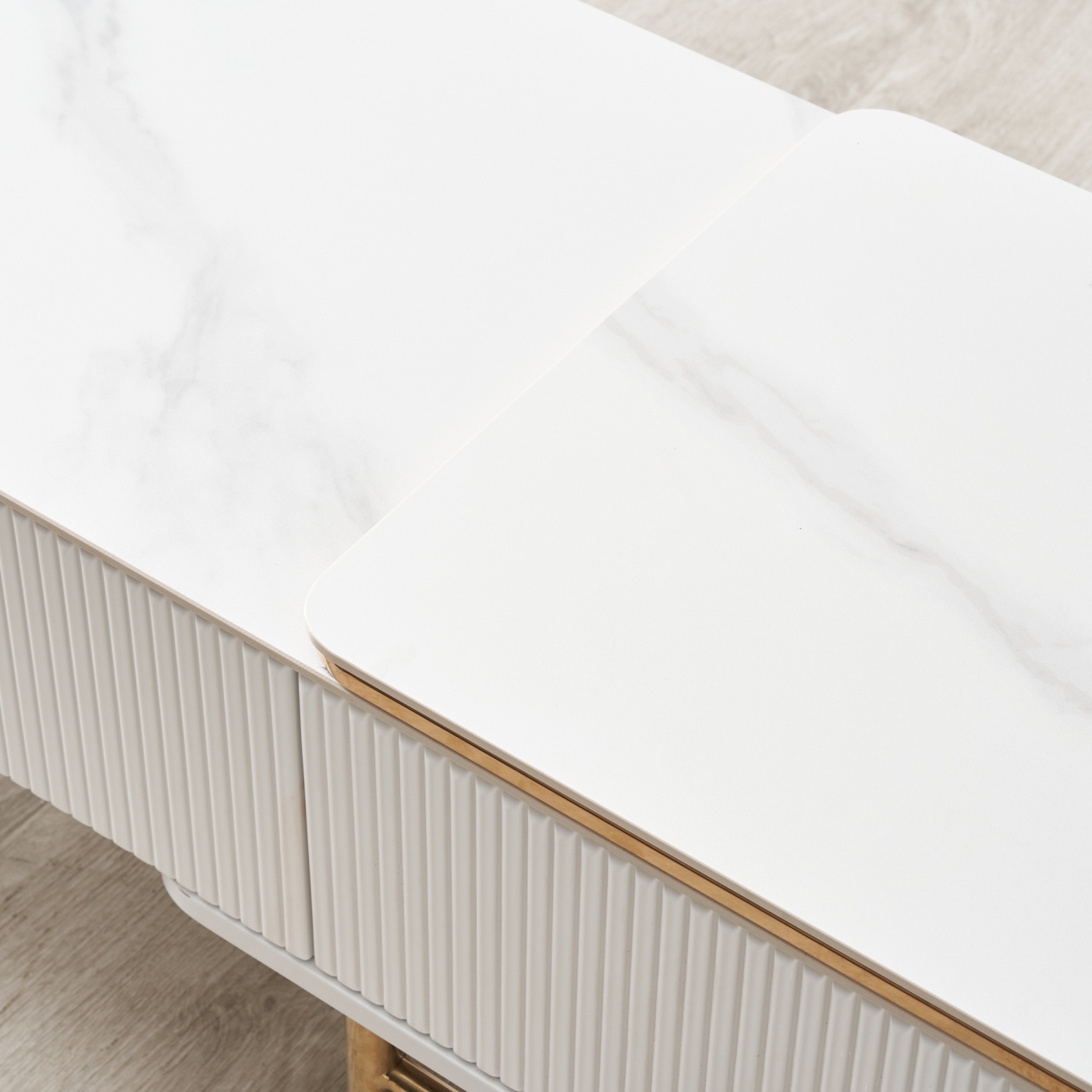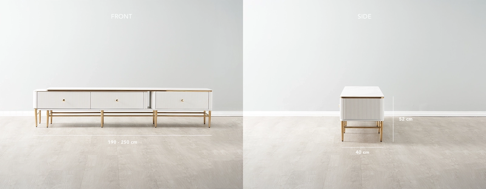 A long section of gorgeous white Sintered Stone serves as the elegant base for your television, record players and more. The Etienne Entertainment Unit's sturdy wooden body houses three pull-out drawers for all your curating needs. The big surprise is the Etienne's pull-out frame that reveals extra shelf space when needed. Pair with one of our gorgeous floor rugs and floor lamps for a sophisticated living room ensemble.